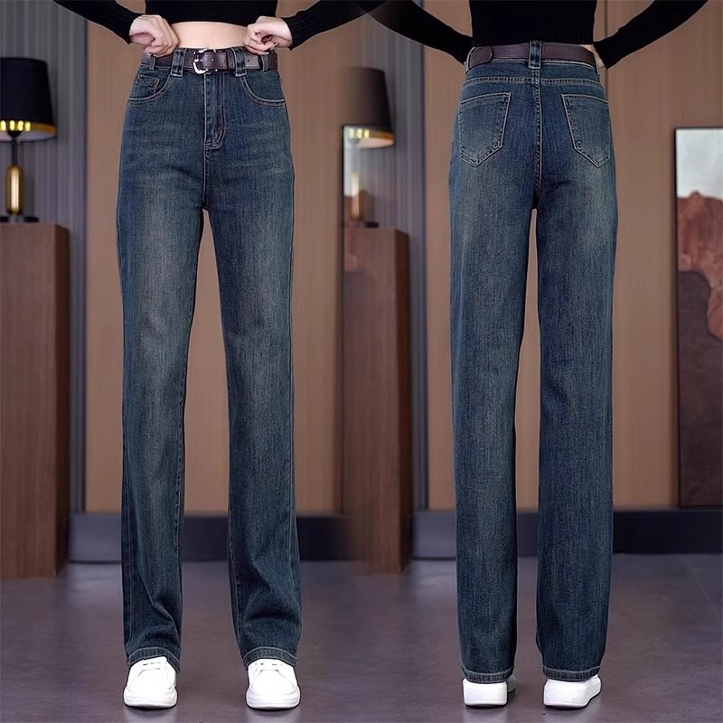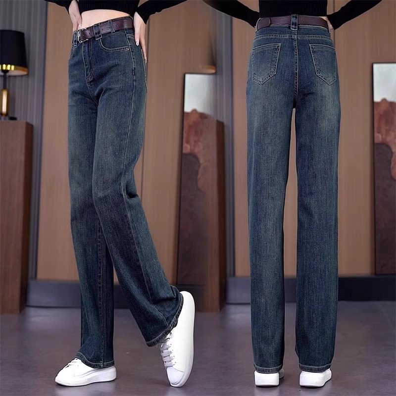 流行水泥灰窄版阔腿牛仔裤女士2025年春秋季新款高腰休闲直筒裤子