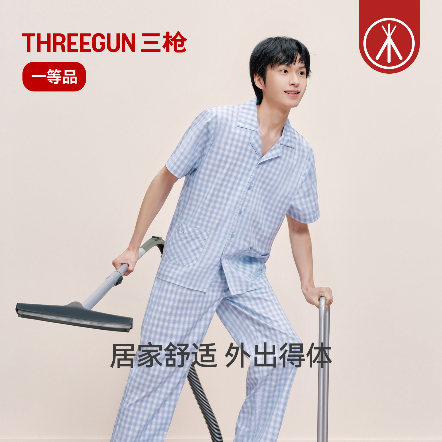 三枪男士100%纯棉梭织格子家居服