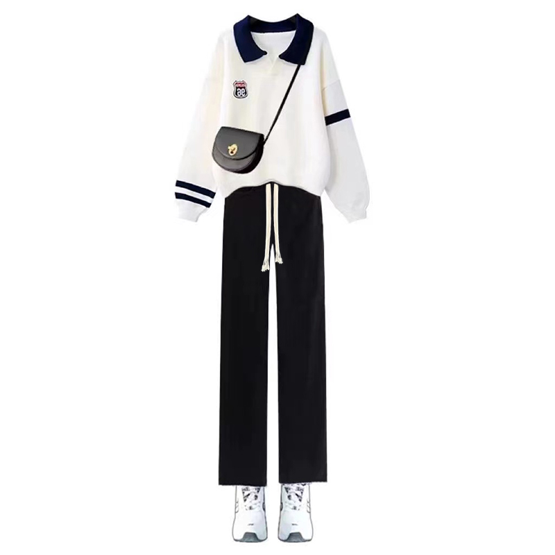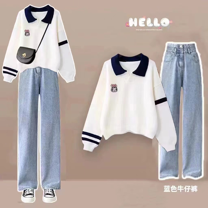 春秋卫衣女套装女学生时尚宽松Polo领卫衣+休闲牛仔裤学院两件套