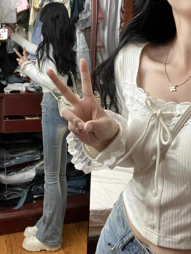 春秋修身短款蕾丝花边蝴蝶结t恤女长袖芭蕾风辣妹方领打底衫上衣