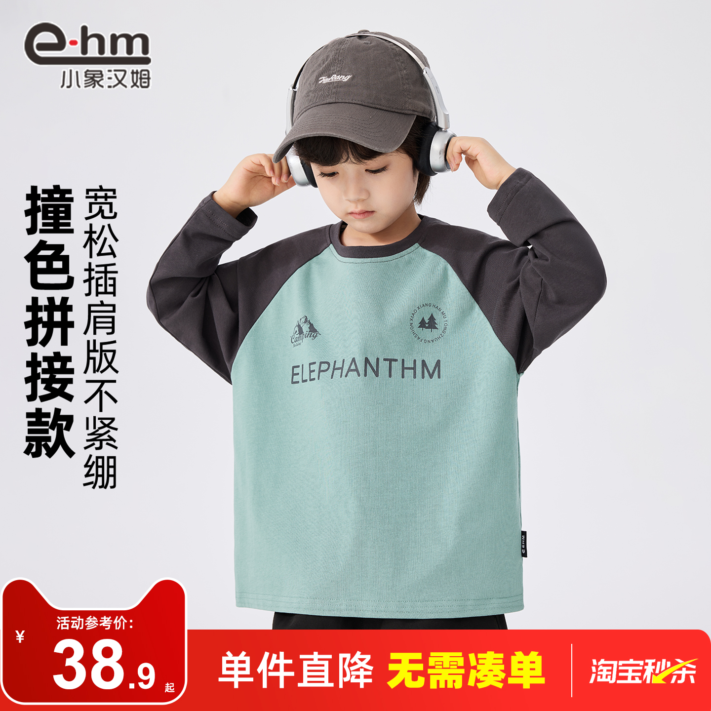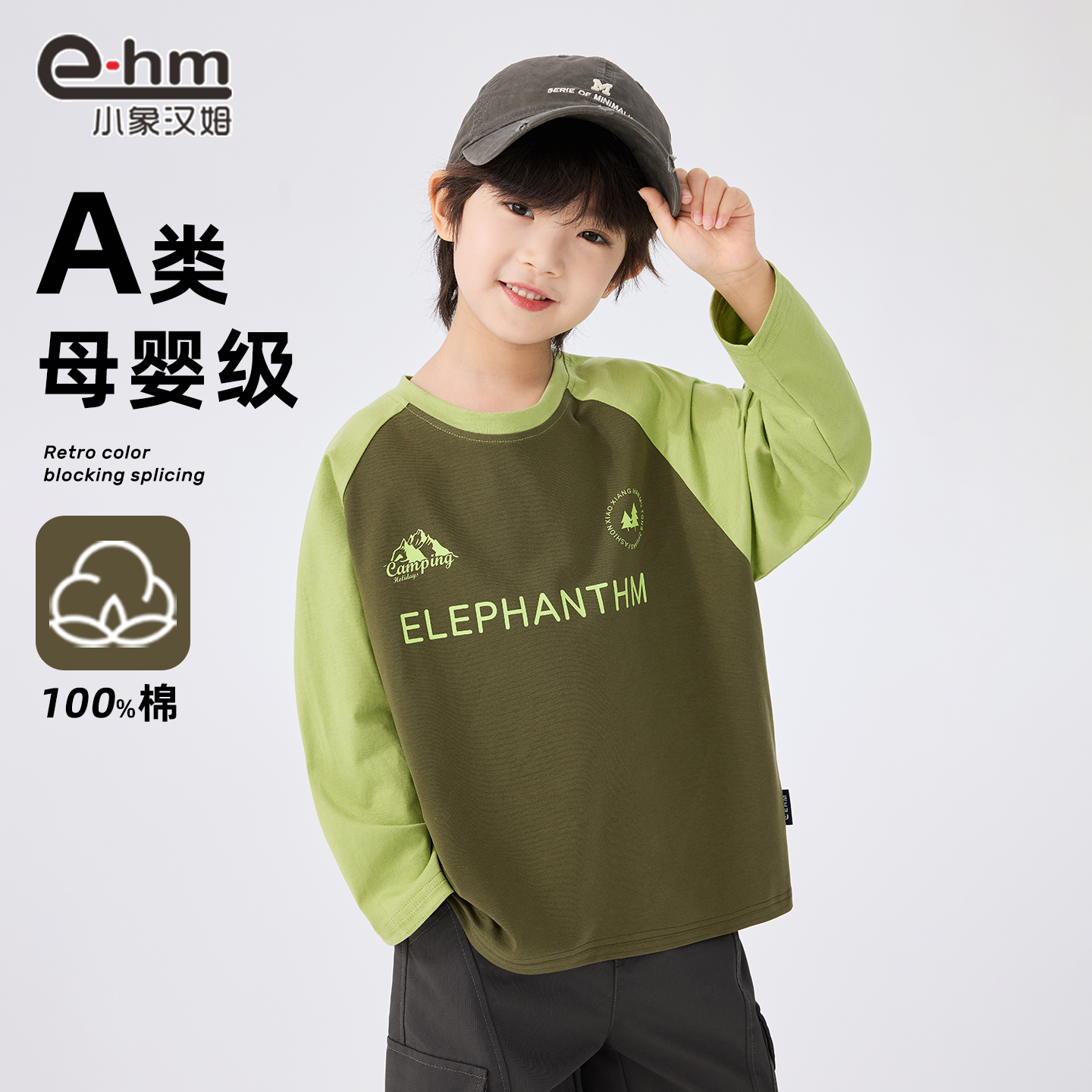 小象汉姆童装男童长袖T恤拼接款纯棉2025秋装儿童打底衫男孩上衣