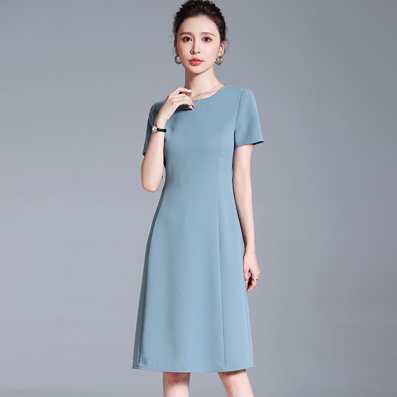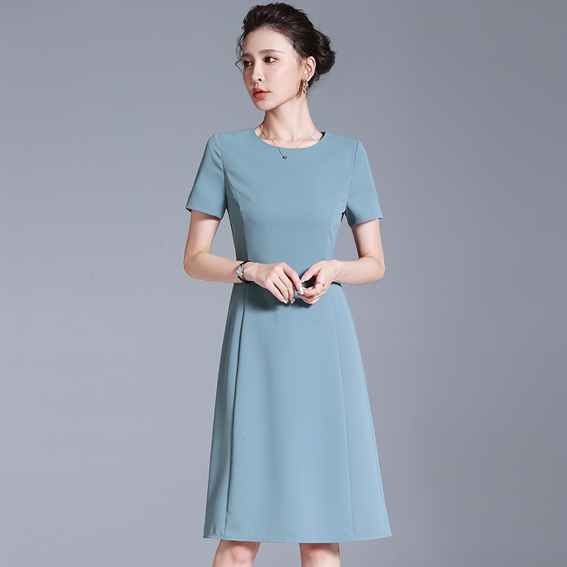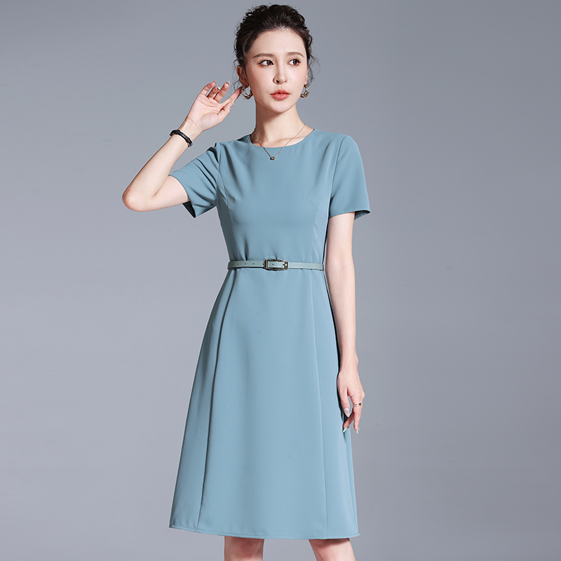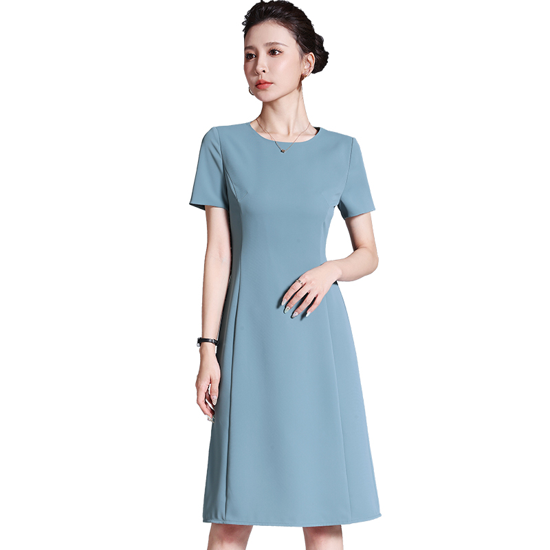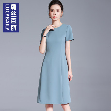 璐丝百丽圆领连衣裙女短袖夏中长款高端职业时尚气质正装显瘦裙子