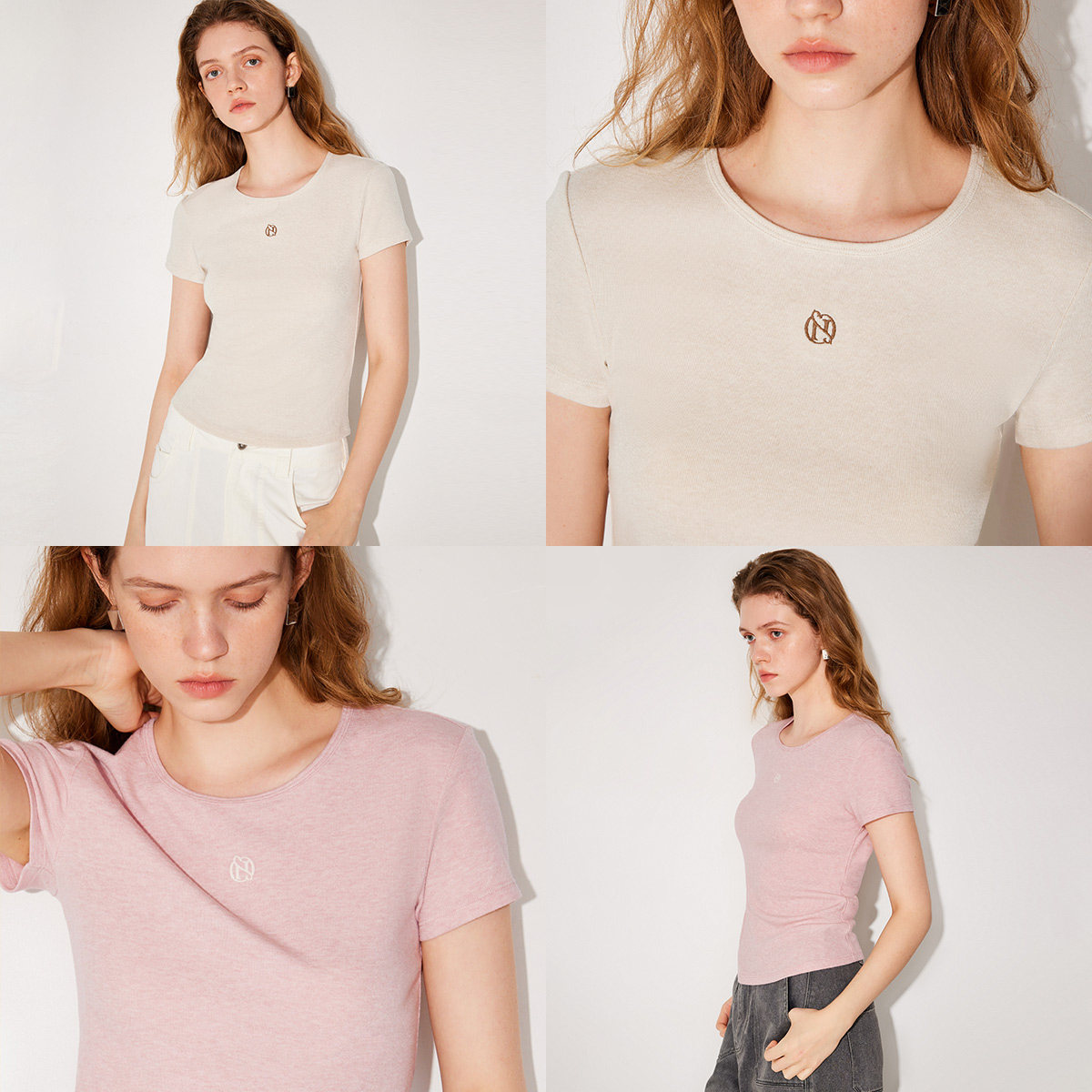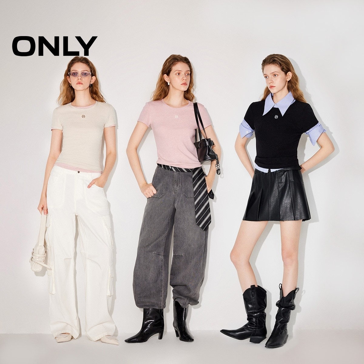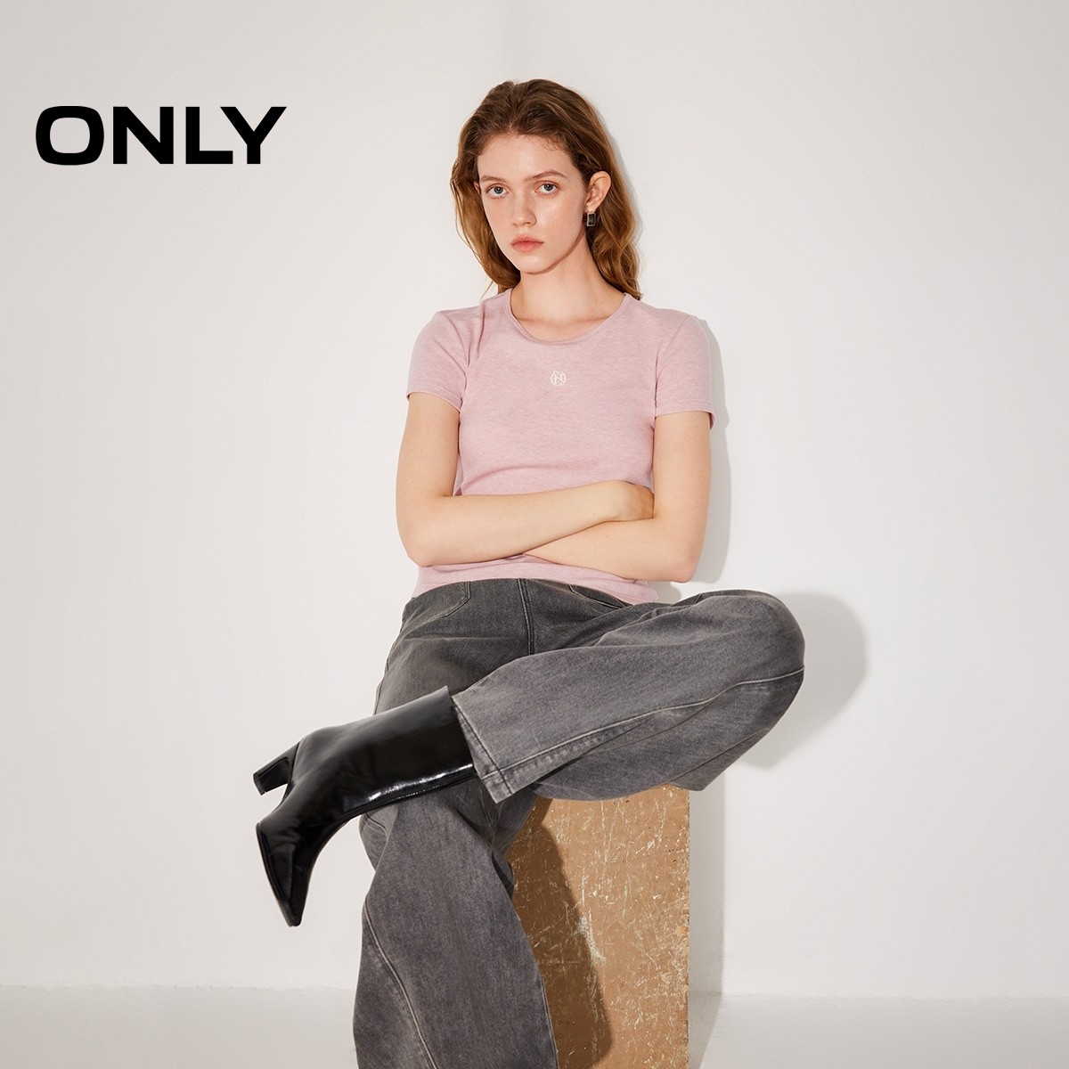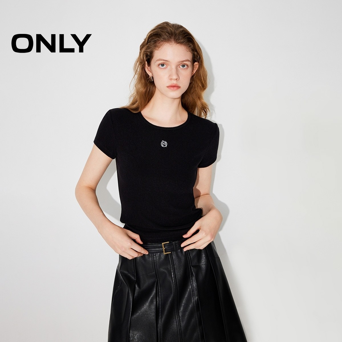 ONLY2026春季新款U型领口弹力修身百搭基础款刺绣正肩短袖T恤女