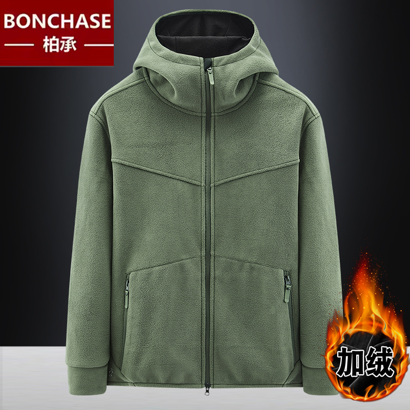 秋冬户外加绒加厚抓绒衣男连帽开衫青年卫衣男装摇粒绒软壳外套潮