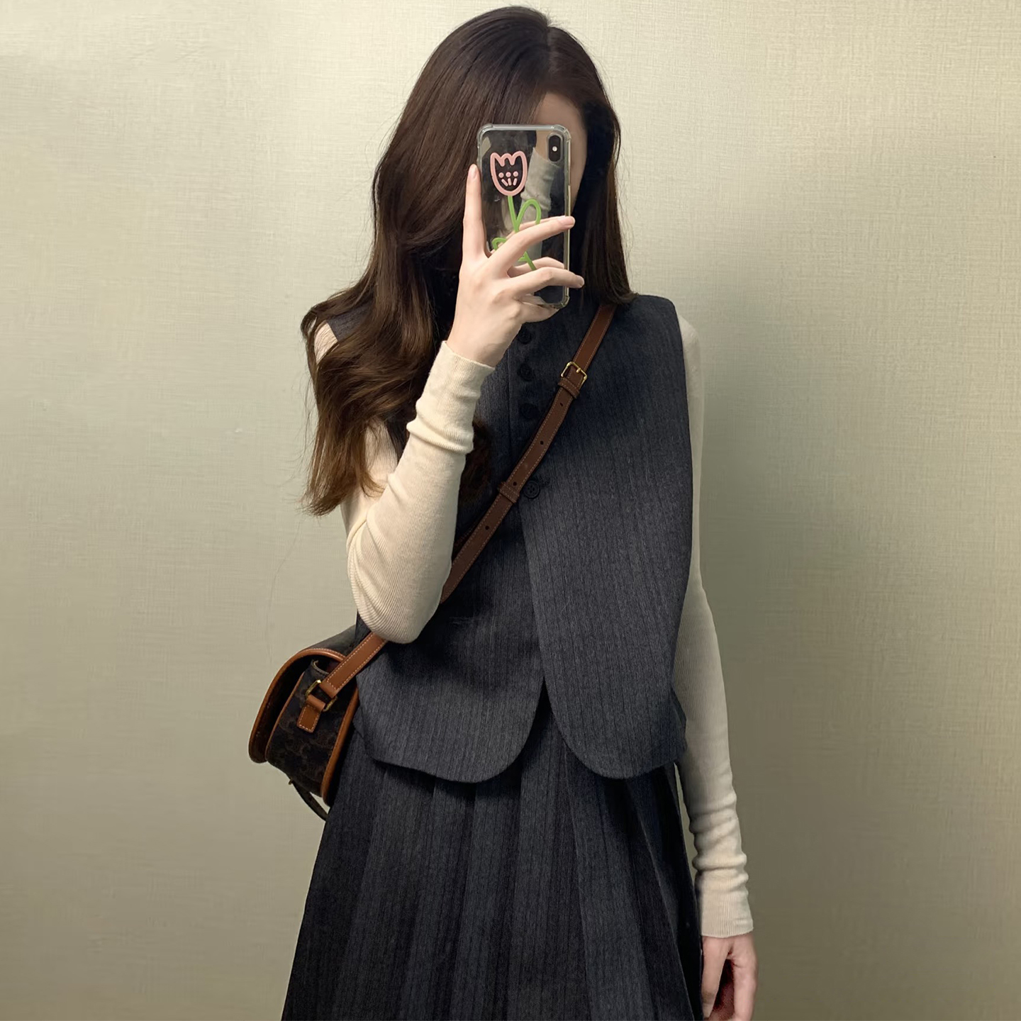 小个子轻熟简约风西装马甲百褶裙两件套女春秋新款通勤气质套装裙