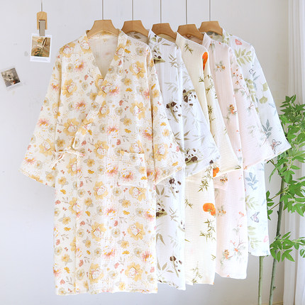 日系纯棉睡袍女薄款纱布中长款浴袍印花家居服春夏秋汗蒸宽松全棉