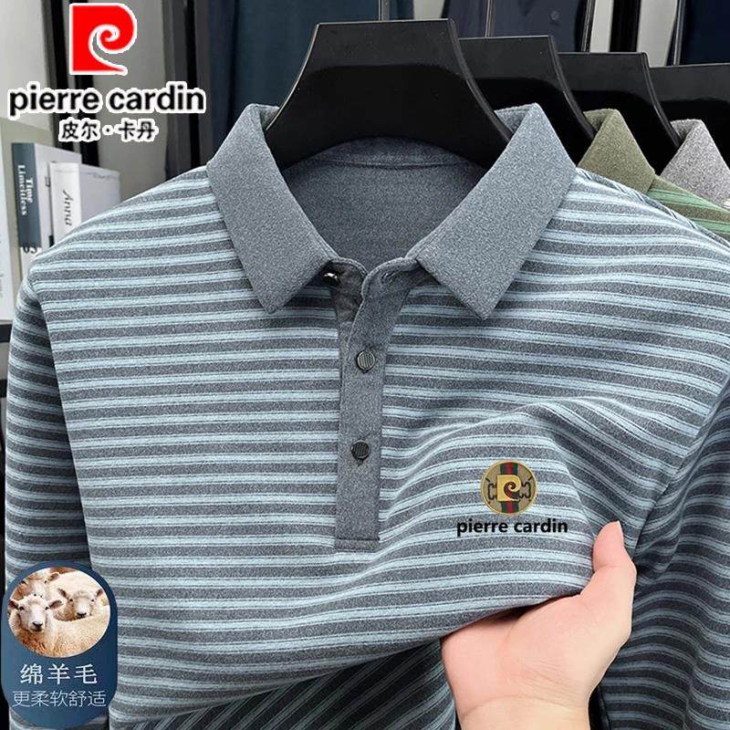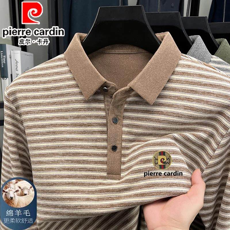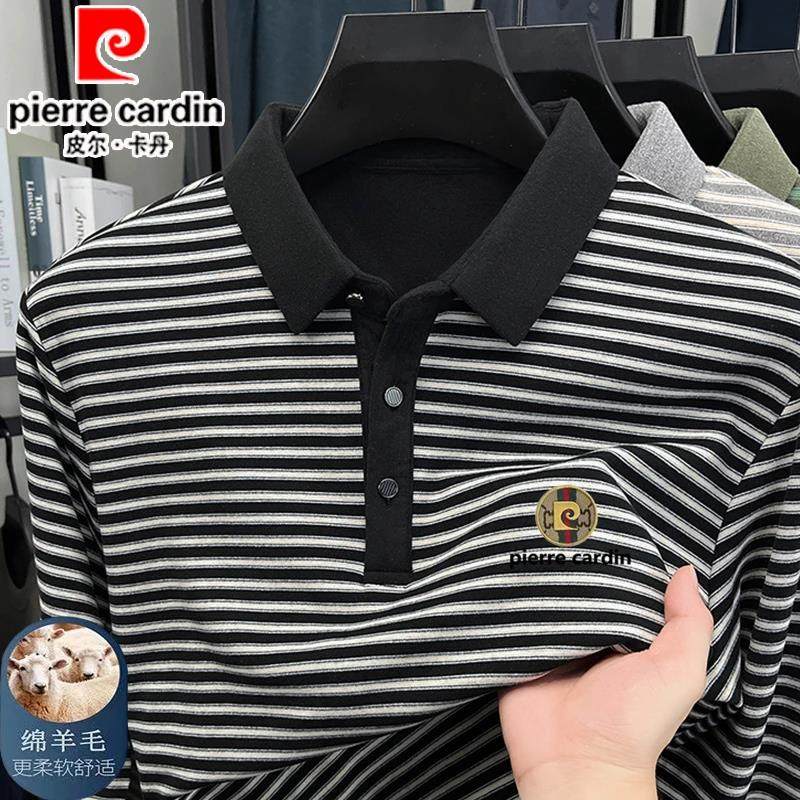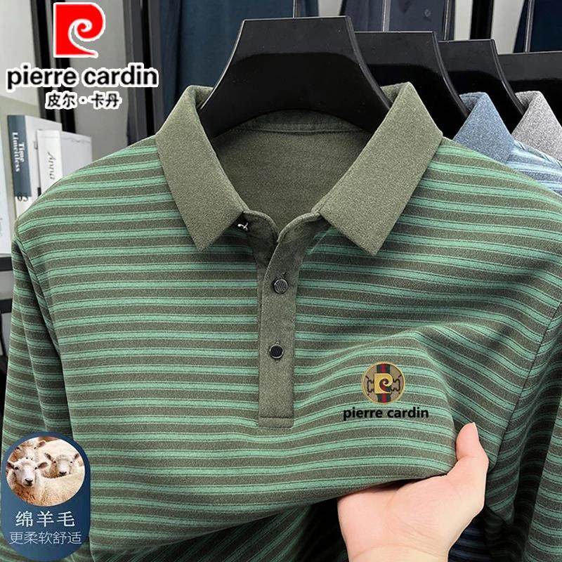 皮尔卡丹男士绵羊毛桑蚕丝长袖T恤中年休闲翻领POLO衫条纹上衣男