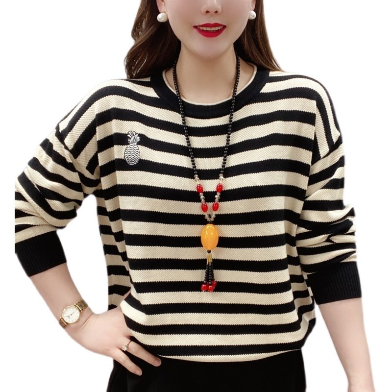 圆领条纹长袖女秋装2024新款薄款针织打底衫春秋宽松上衣洋气毛衣