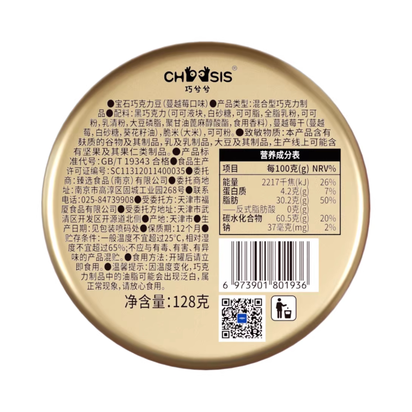 巧兮兮宝石巧克力豆蔓越莓味128g*1罐装纯可可脂夹心休闲坚果零食
