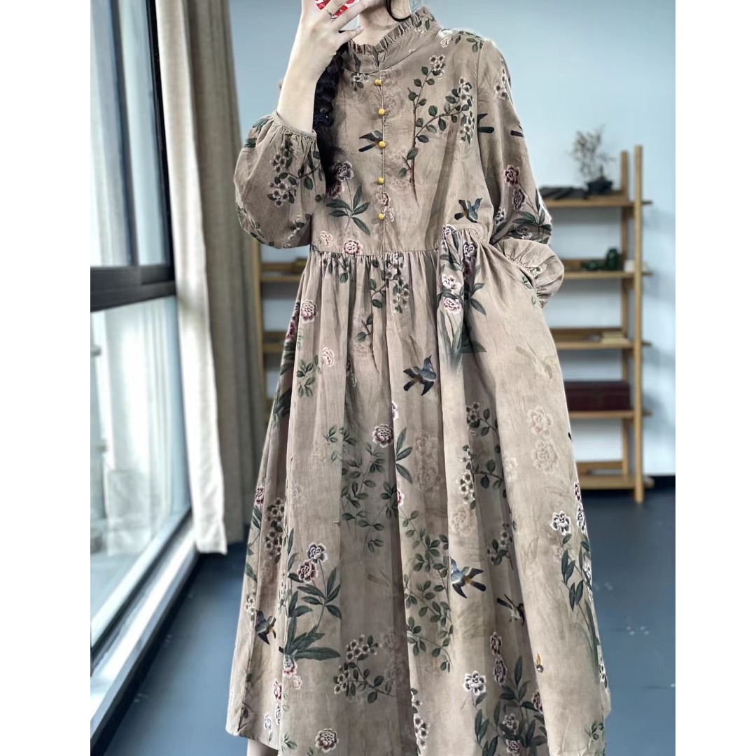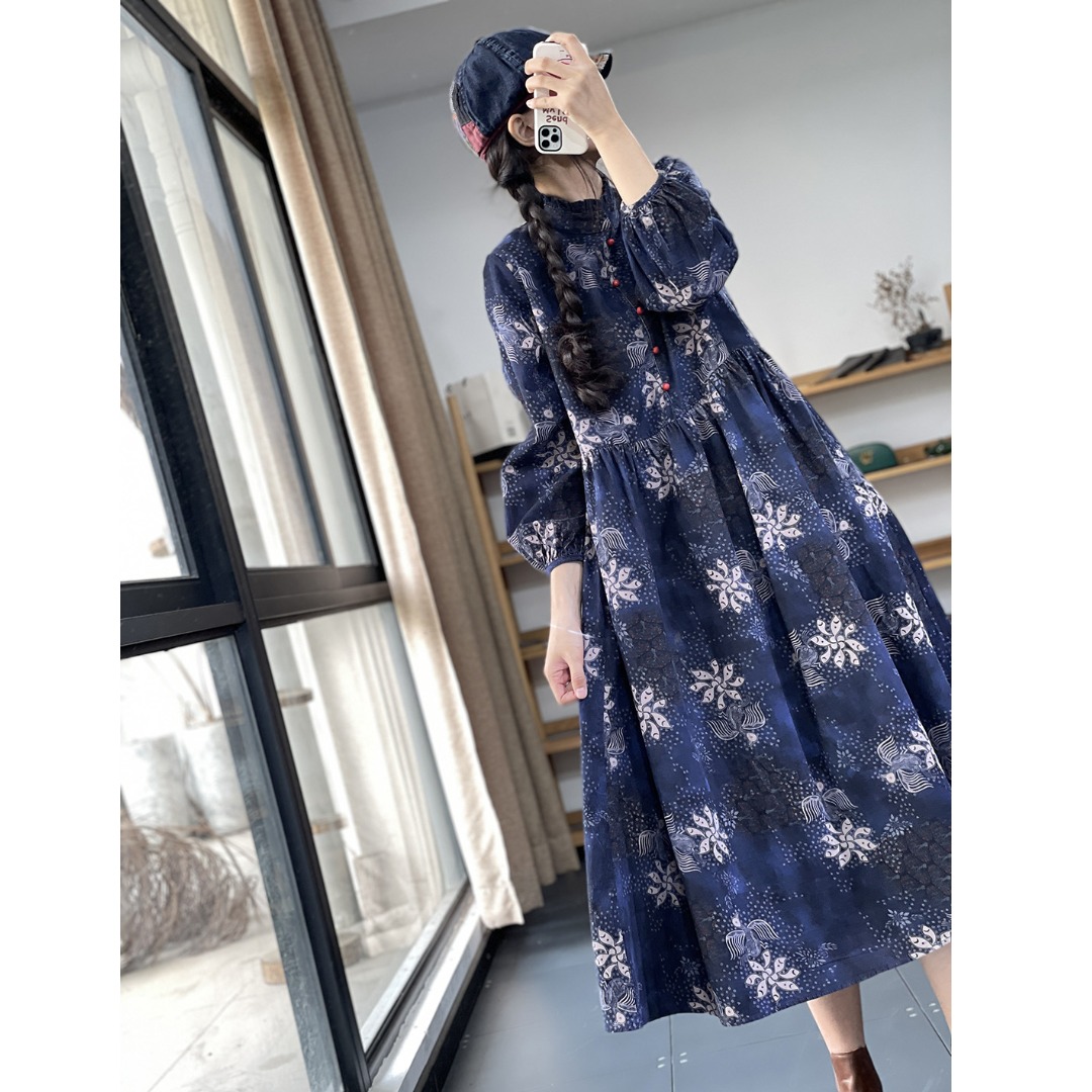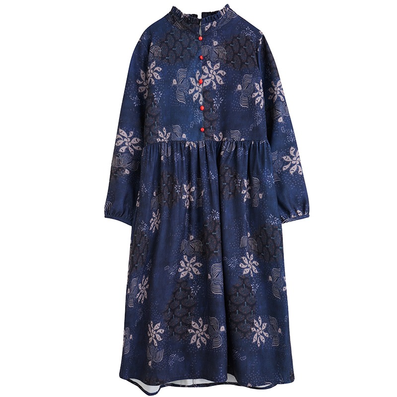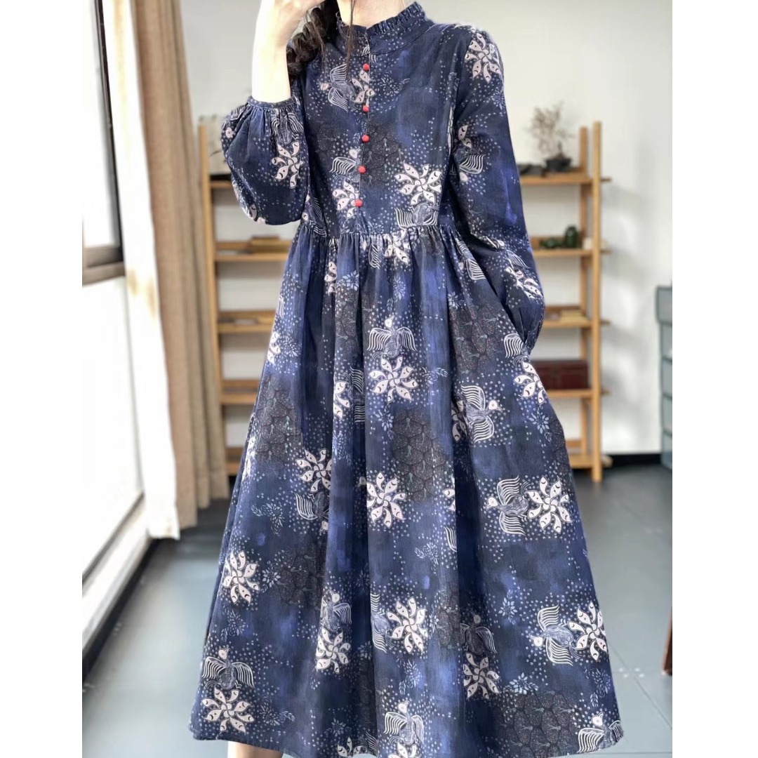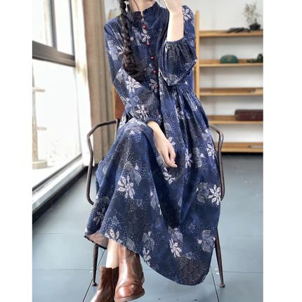 复古文艺风印花撞色珠扣木耳领口长袖高腰气质减龄棉麻连衣裙