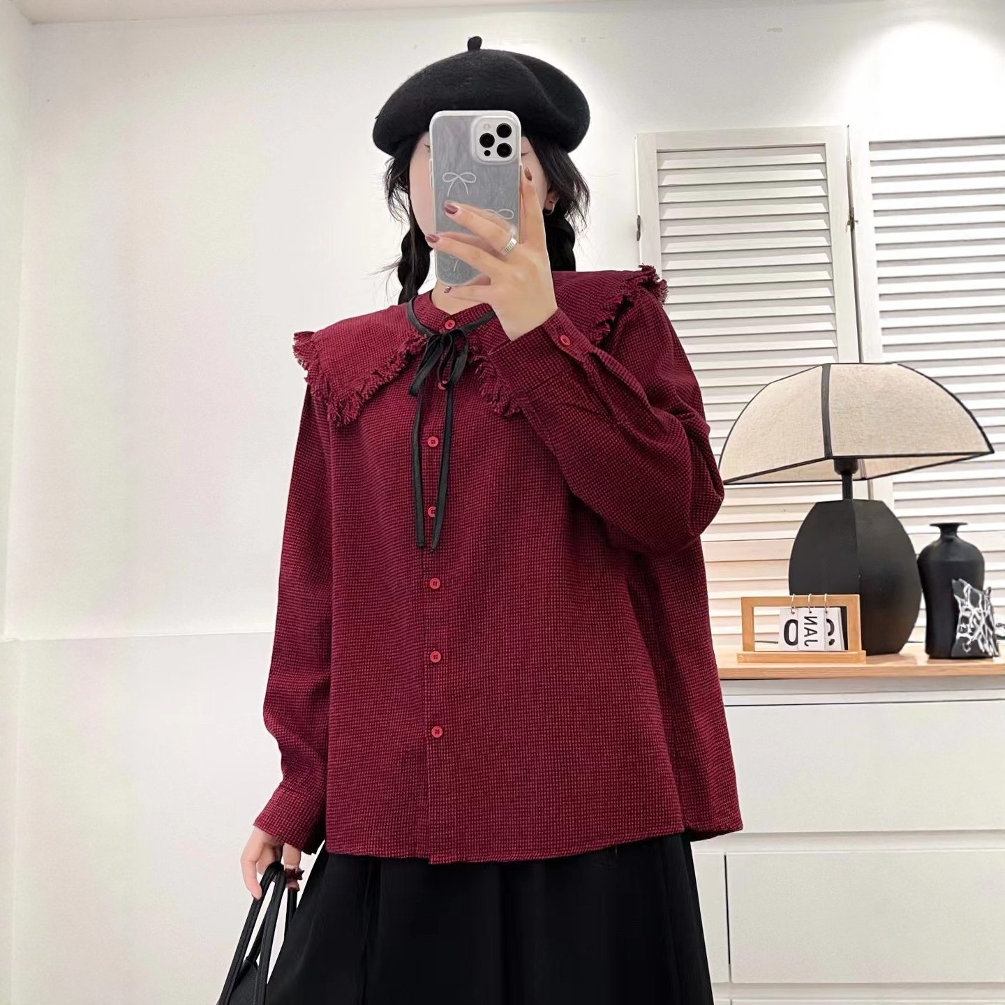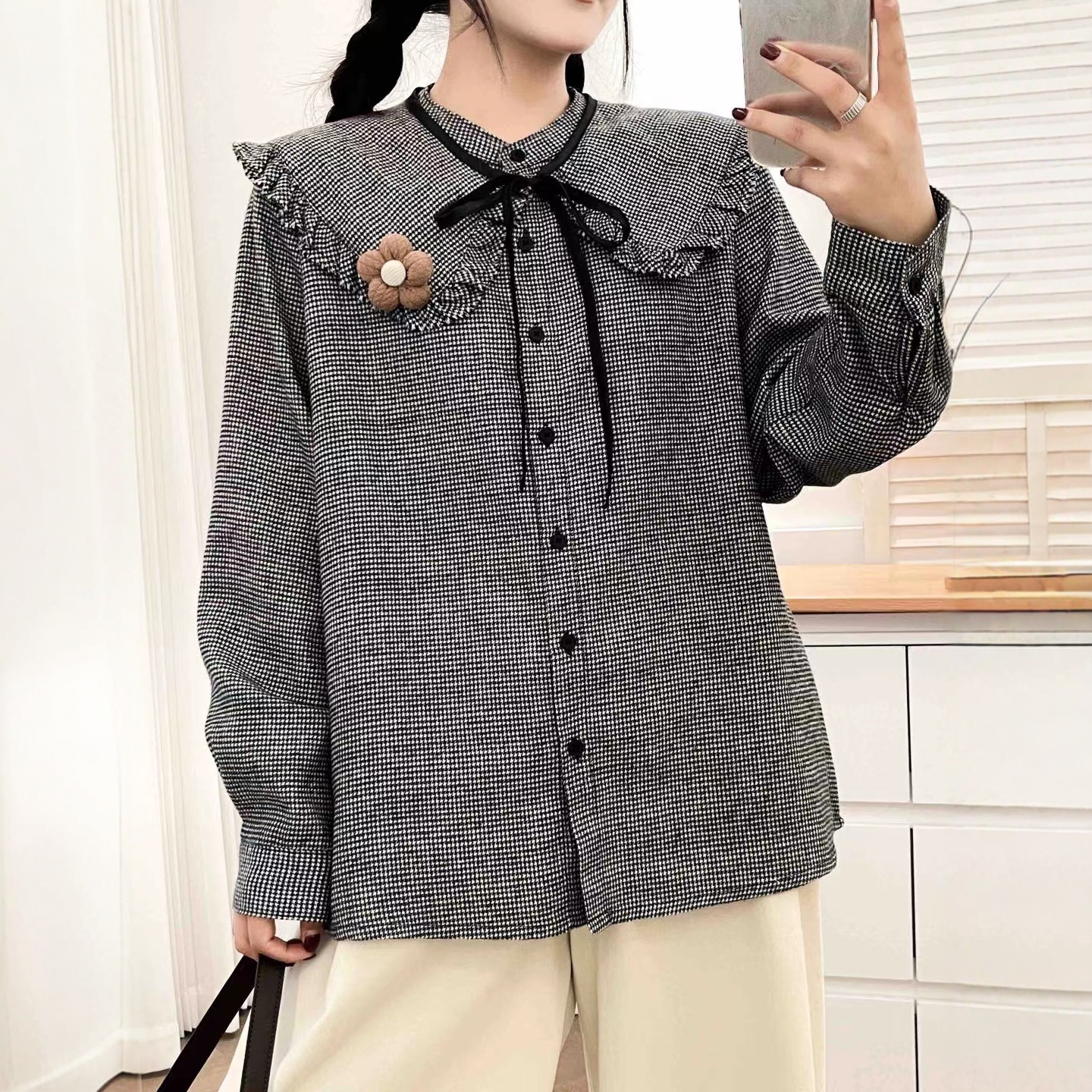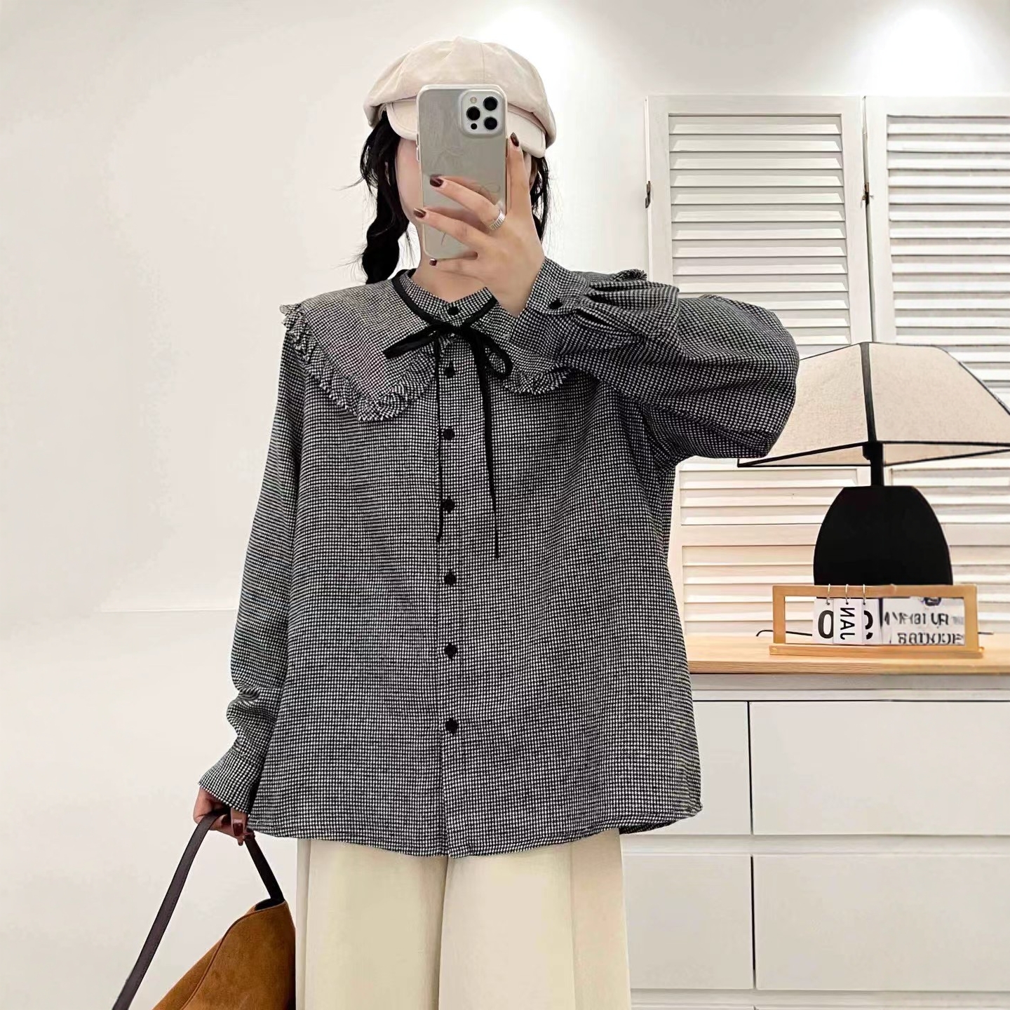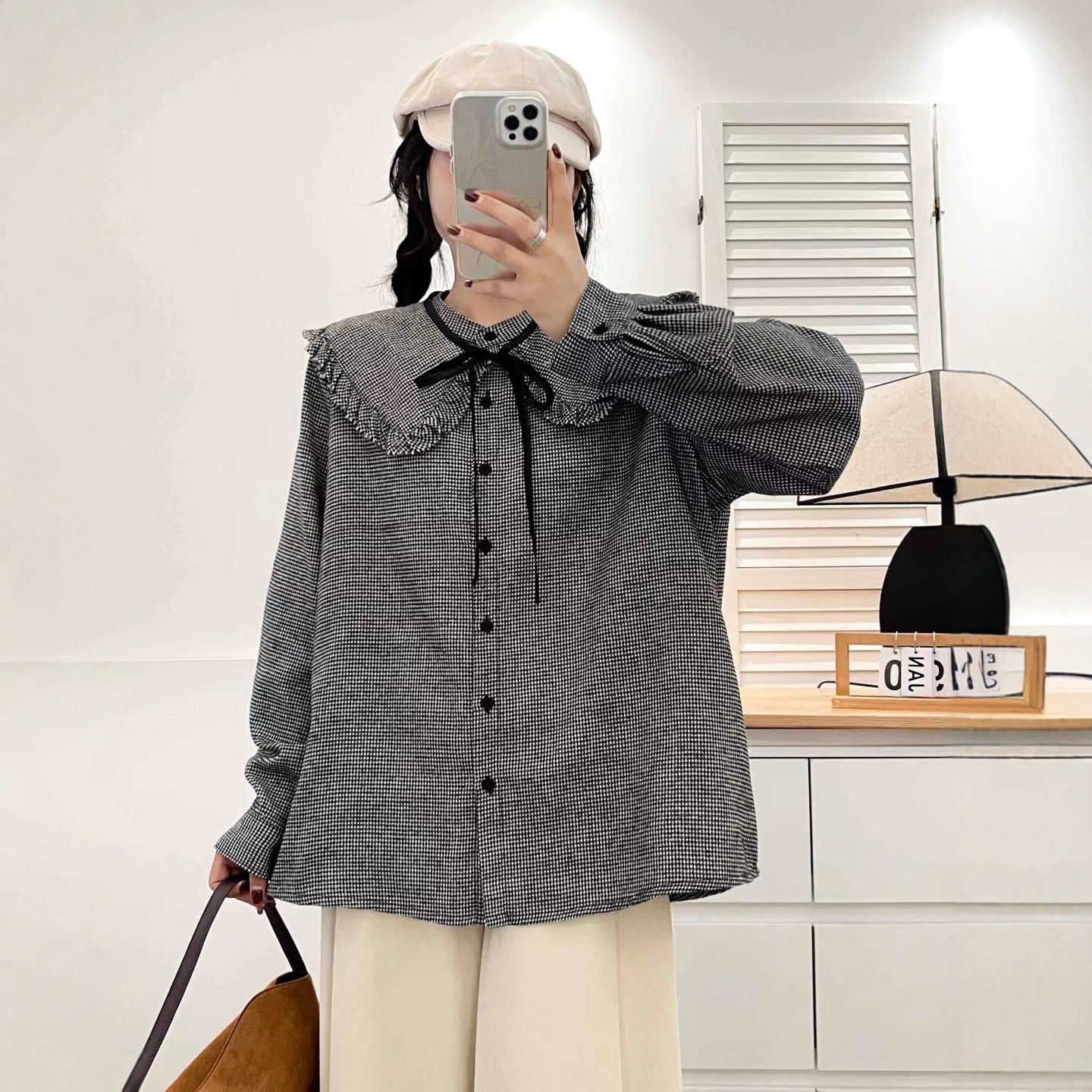 日系经典千鸟格可脱卸系带娃娃领衬衫宽松减龄磨毛纯棉长袖上衣女