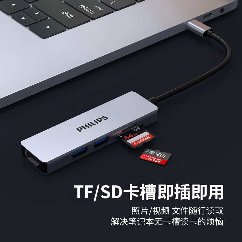 飞利浦TypeC扩展坞usb-c转hdmi转接头读卡器SD/TF拓展适用手机MacBookAir电脑ipadPro平板笔记本5合1转换器