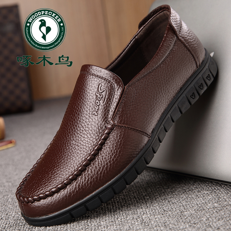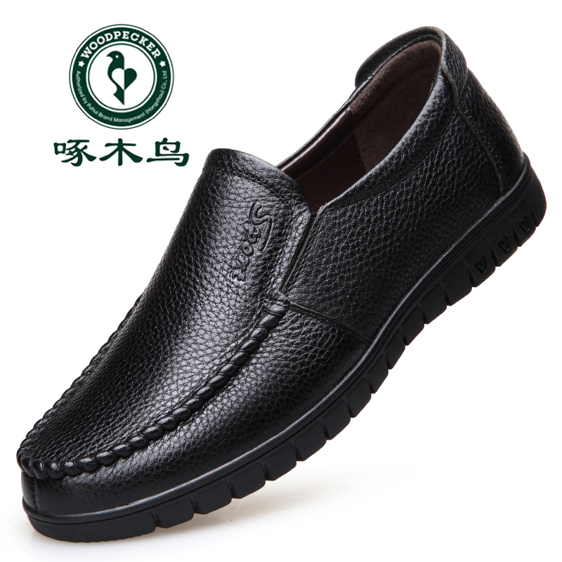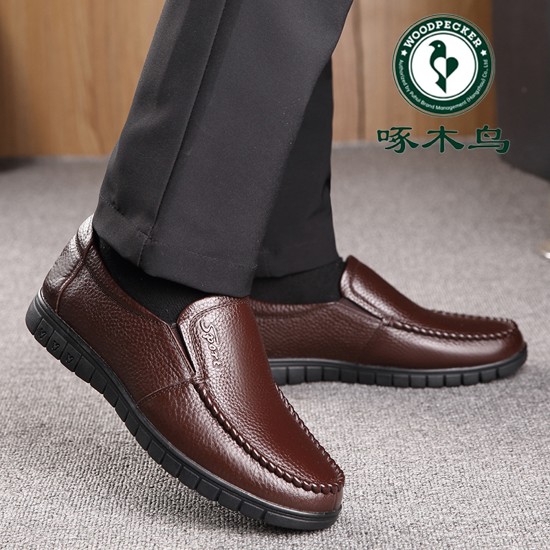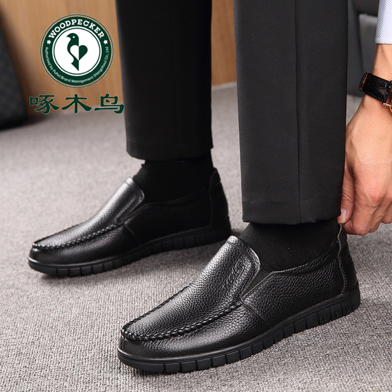 啄木鸟男鞋秋季时尚商务休闲皮鞋男真皮舒适套脚软底中老年爸爸鞋