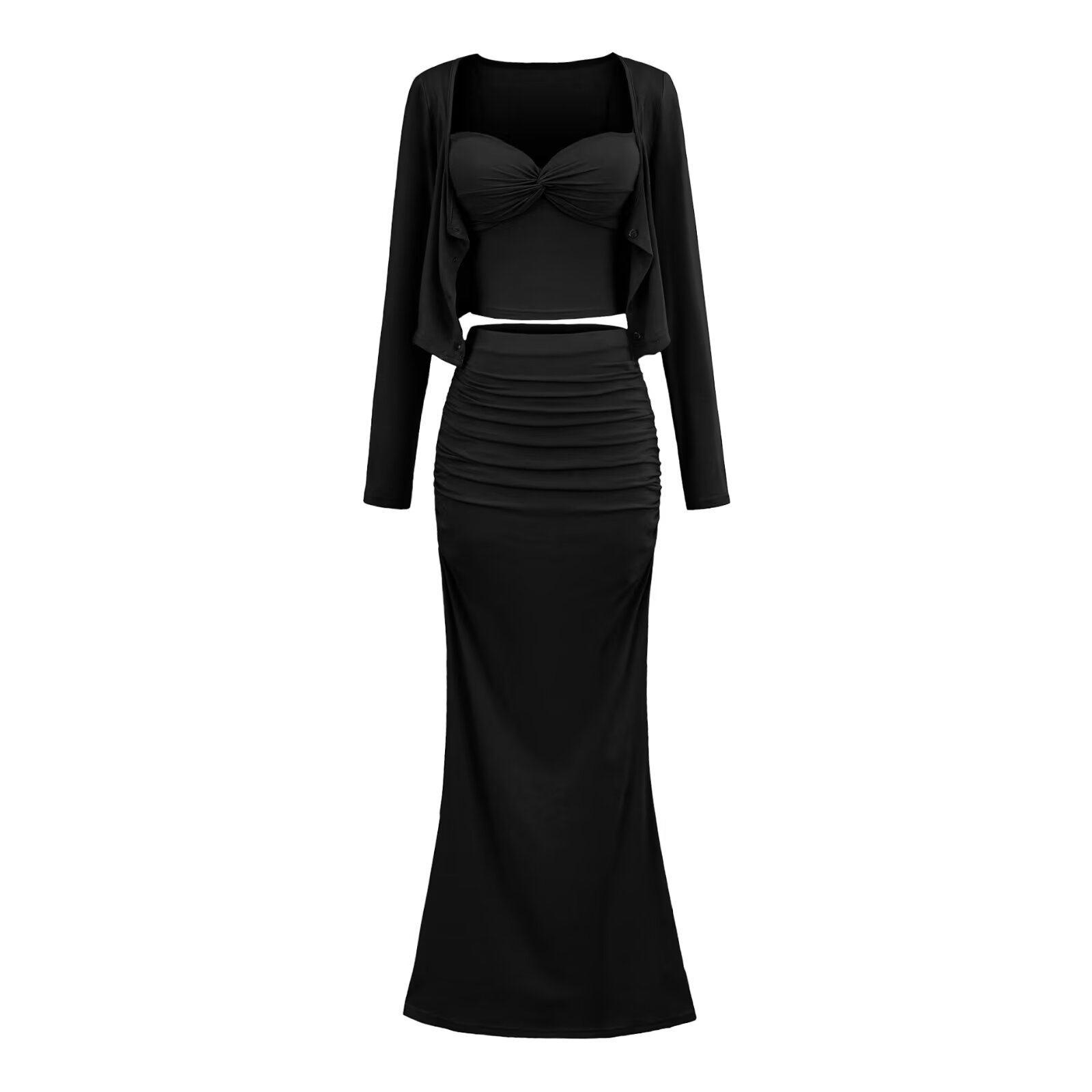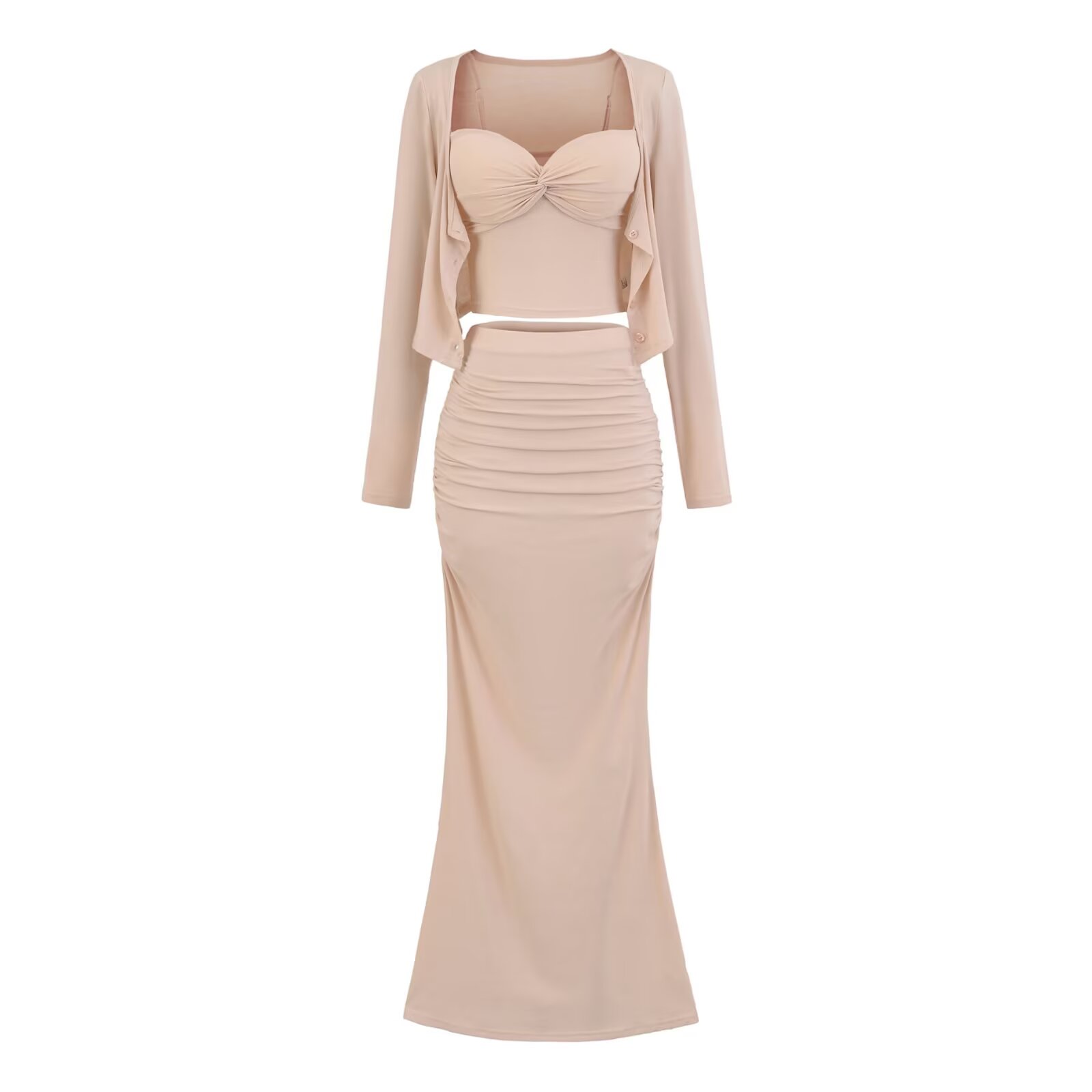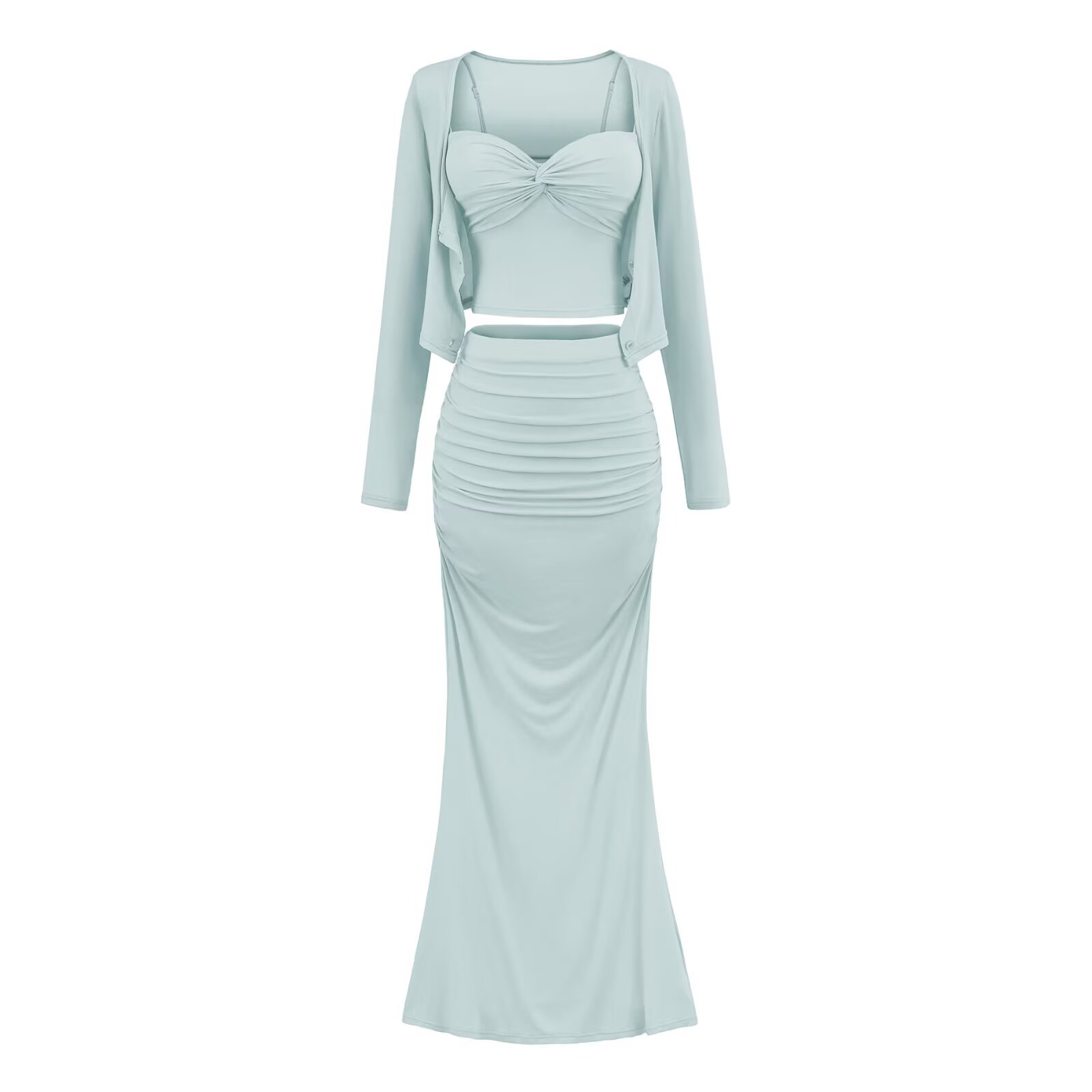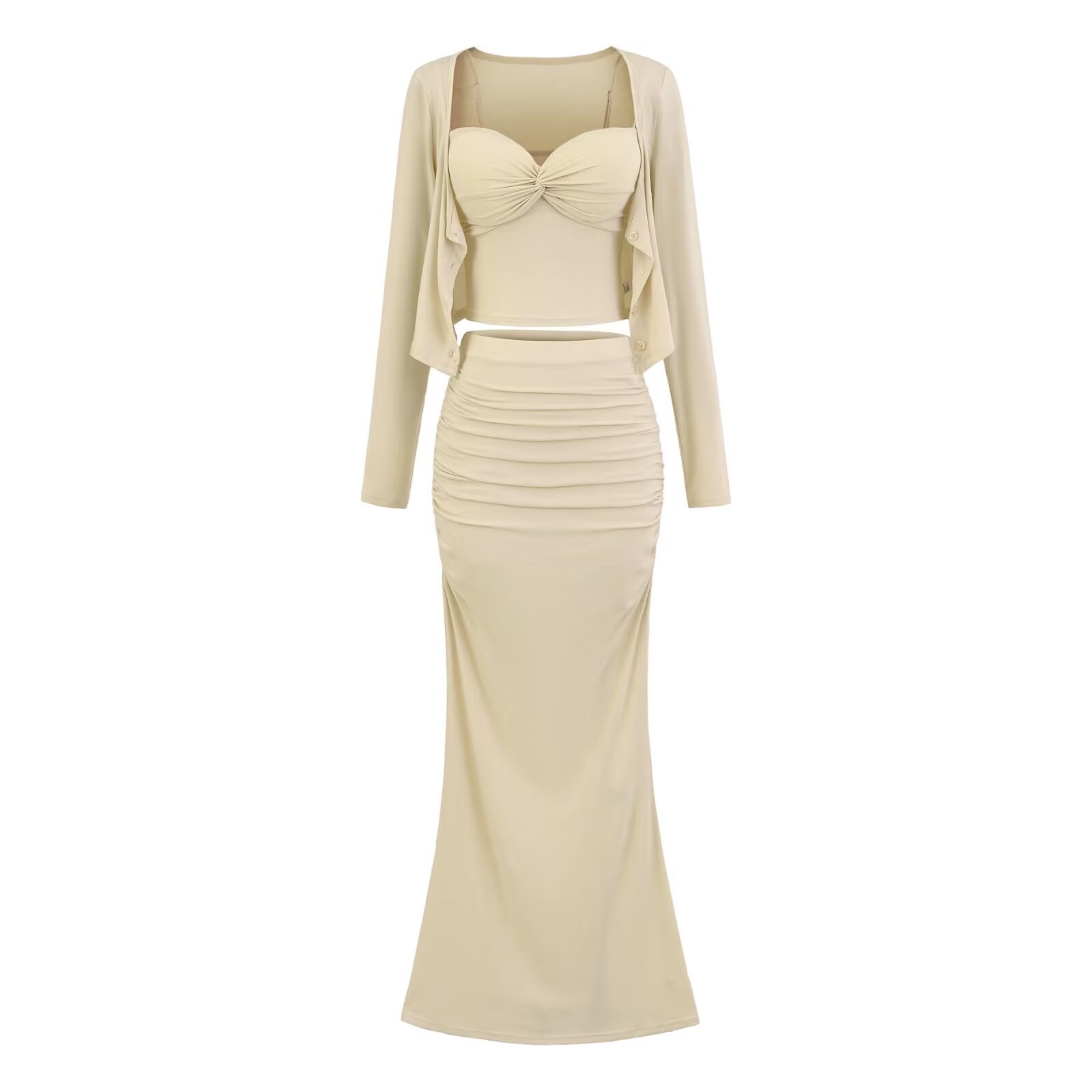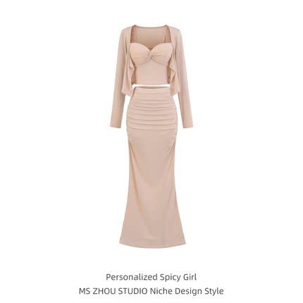 法式温柔风扭结吊带背心长袖针织开衫女高腰褶皱鱼尾半身裙三件套