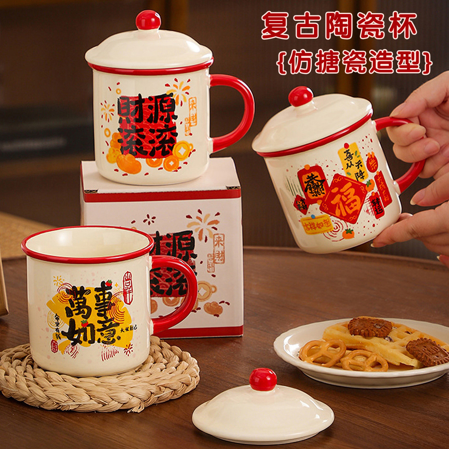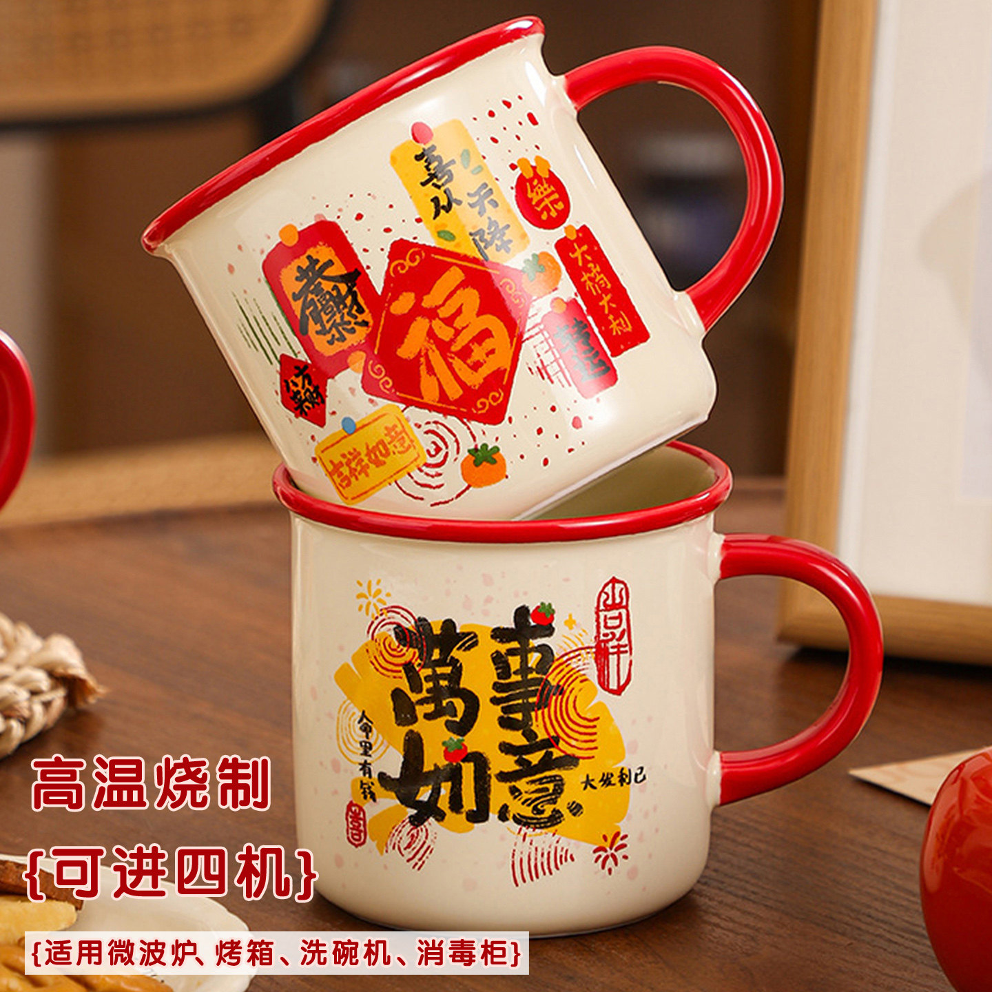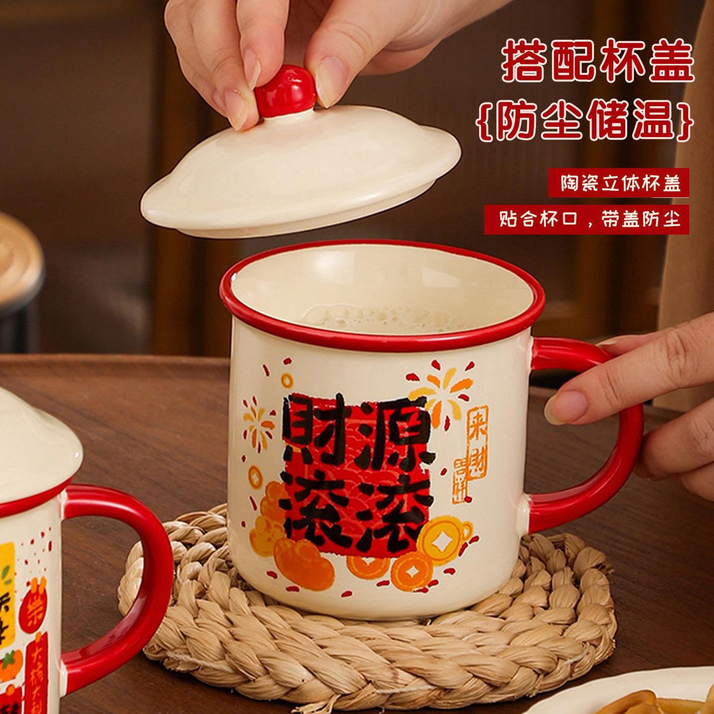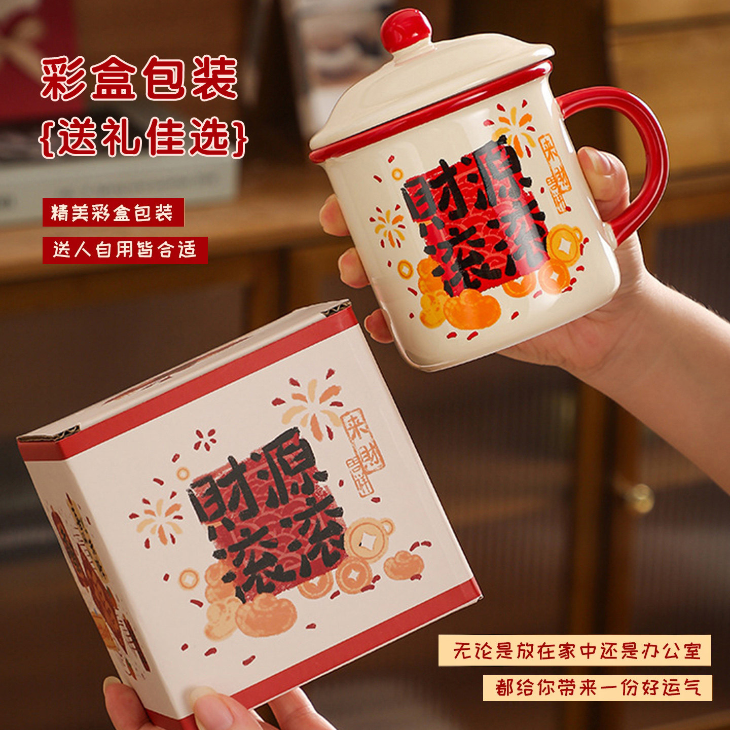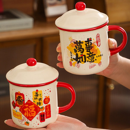 新年喜庆带盖陶瓷水杯