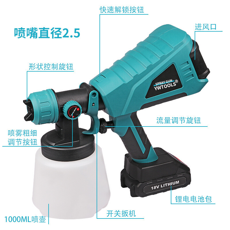 18V锂电喷枪充电式电动喷漆枪 无线油漆乳胶漆喷涂工具便携式喷枪