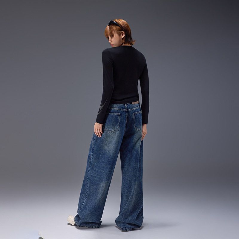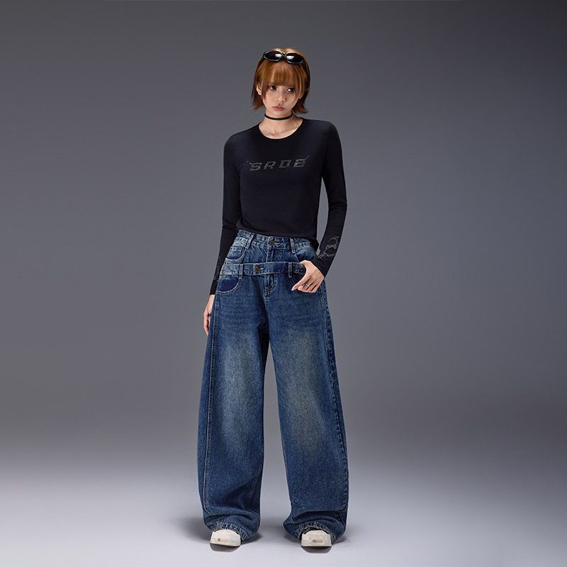 拓谷街头解构牛仔裤阔腿裤女秋季韩版时髦高腰宽松显瘦弯刀裤子女