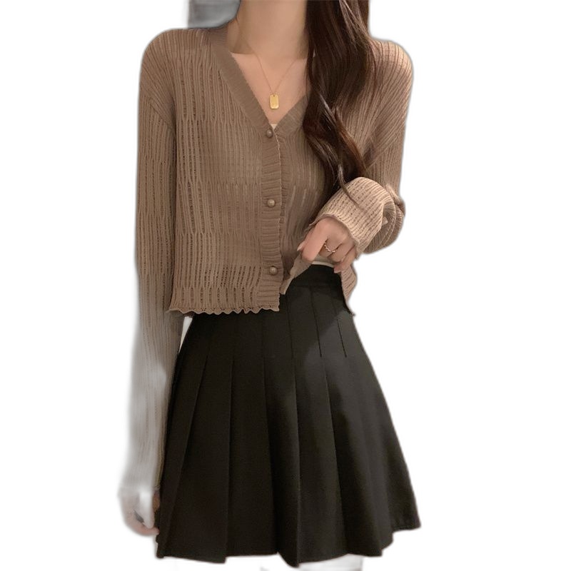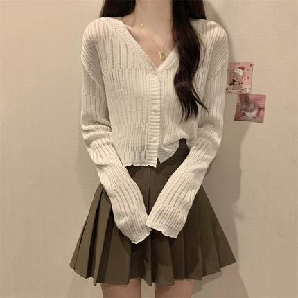 薄款木耳边V领针织衫女夏季新款长袖防晒小开衫显瘦短款外搭上衣