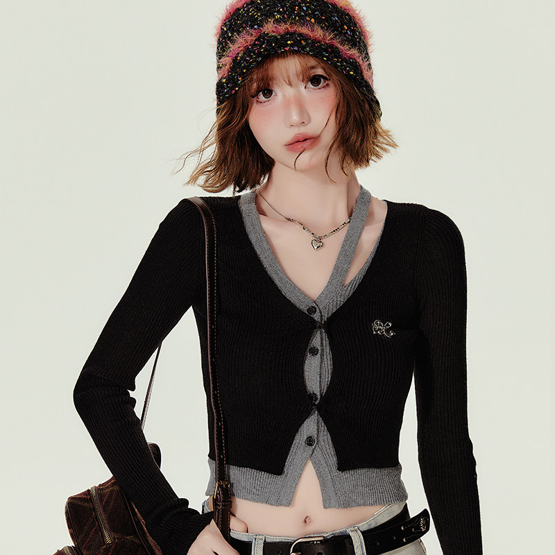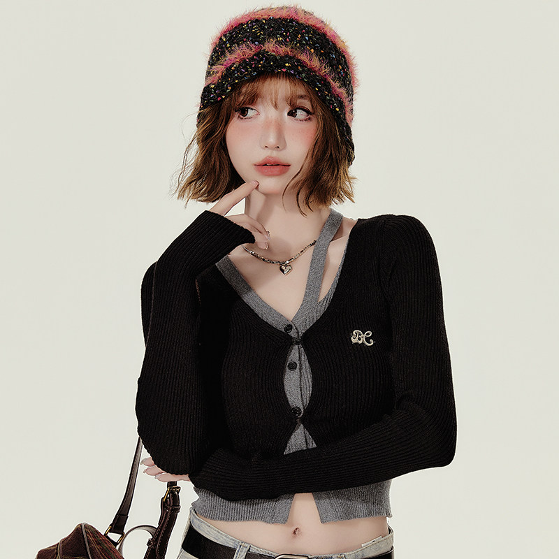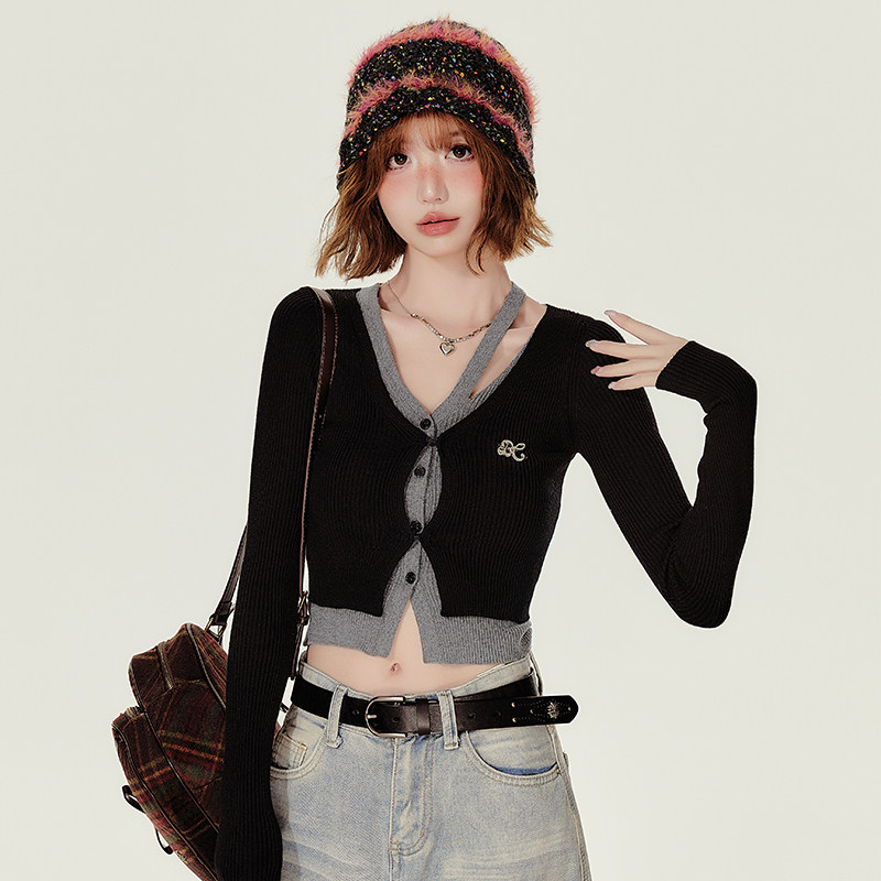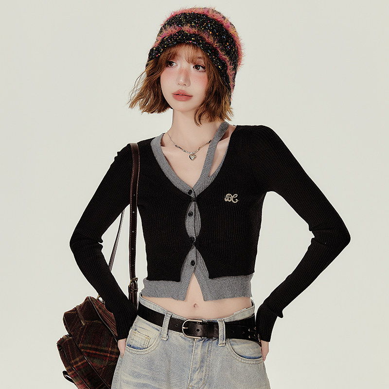Girlyhalo美式辣妹假两件V领短款针织衫长袖女秋新款短款修身毛衣