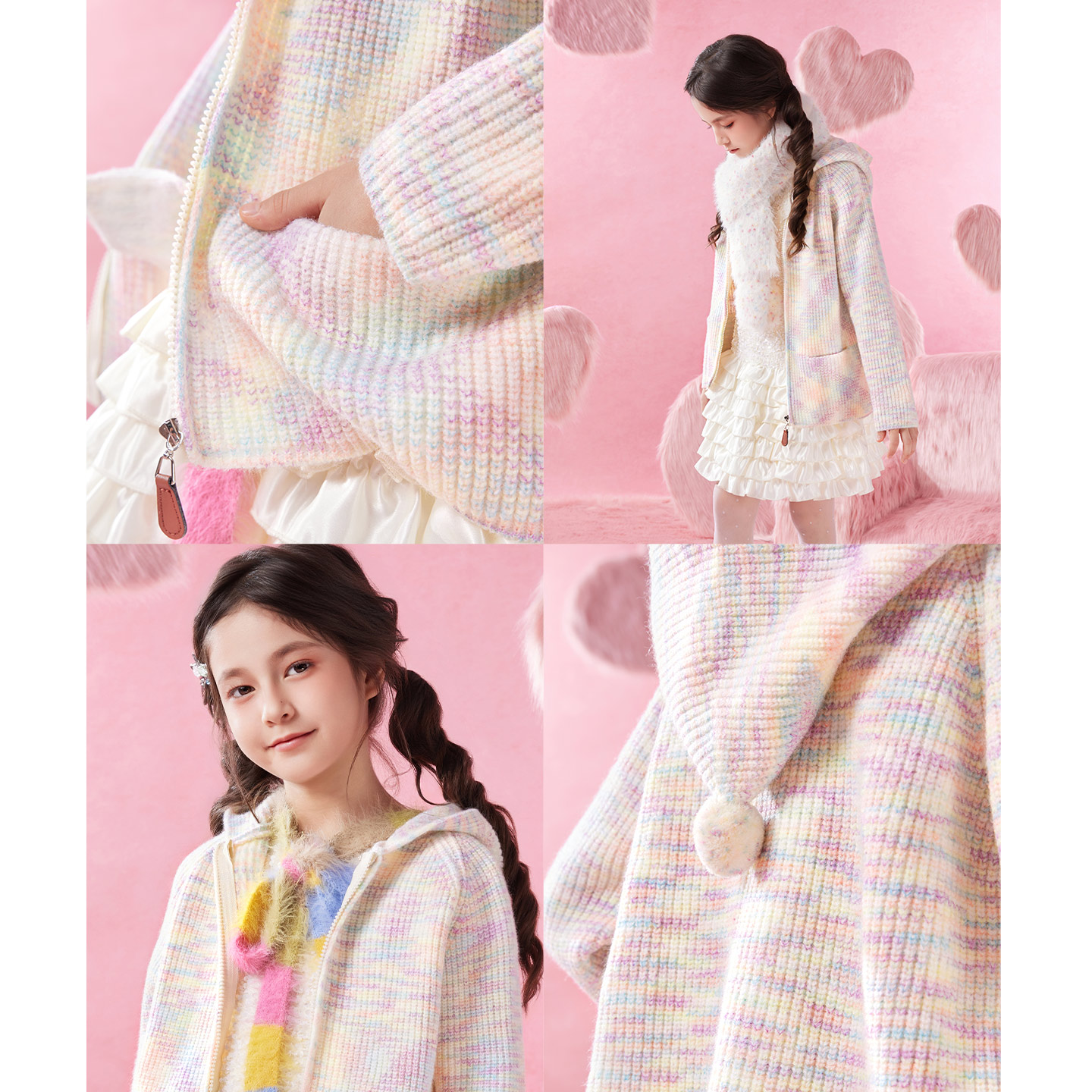 小虎帕蒂秋冬新款女童彩纱连帽毛衣加厚保暖针织开衫女宝洋气外套