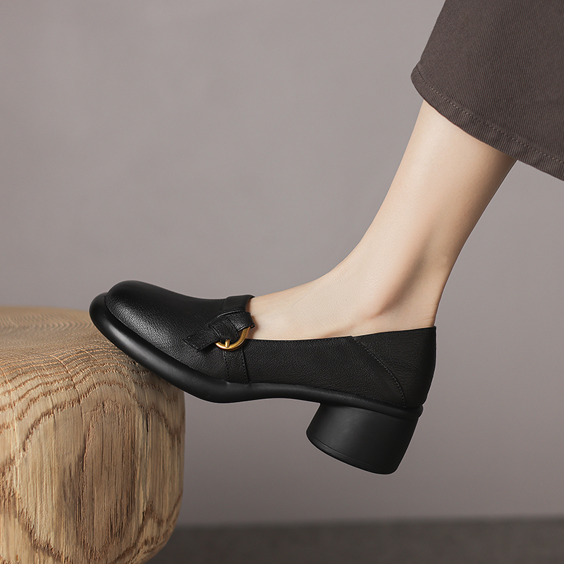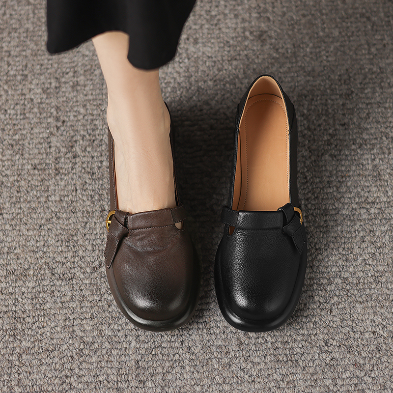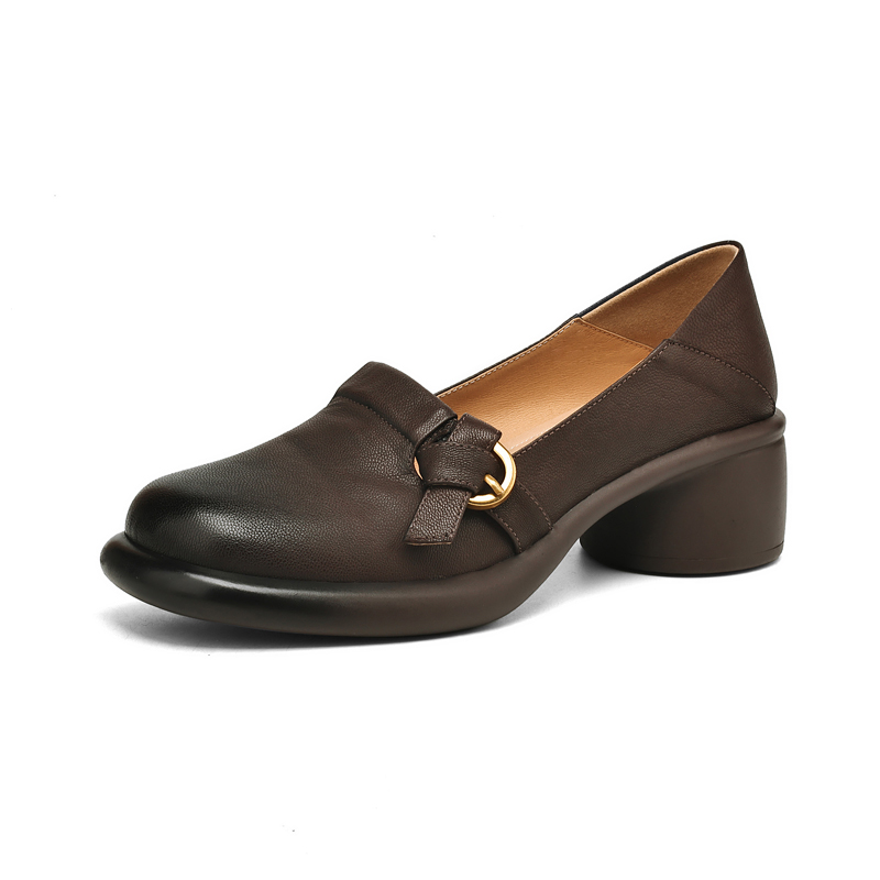 棕色复古英伦风粗跟厚底单鞋女2025秋新款真皮圆头浅口中跟乐福鞋