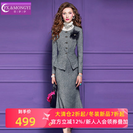 菲梦伊原创高级灰小香风时尚套装女秋季气质优雅毛呢外套鱼尾半裙