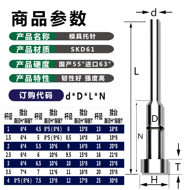 国产SKD61模具托针带拖顶针变径顶杆直径2.5mm*100/150/200/250mm