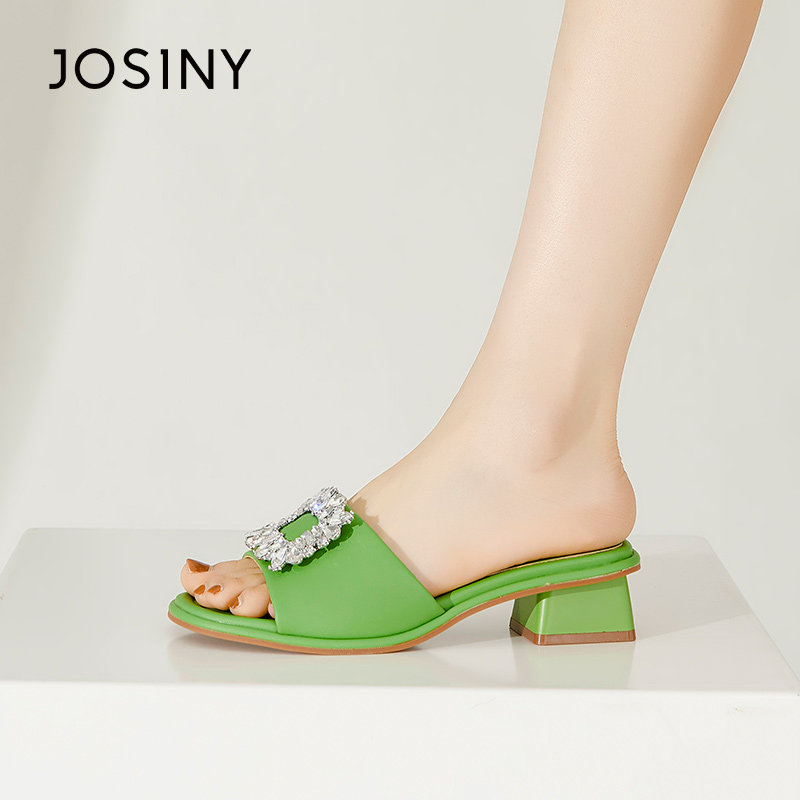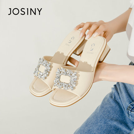卓诗尼女凉鞋圆头一字拖鞋女夏新款方形水钻饰扣低跟外穿方跟拖鞋