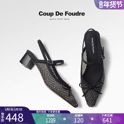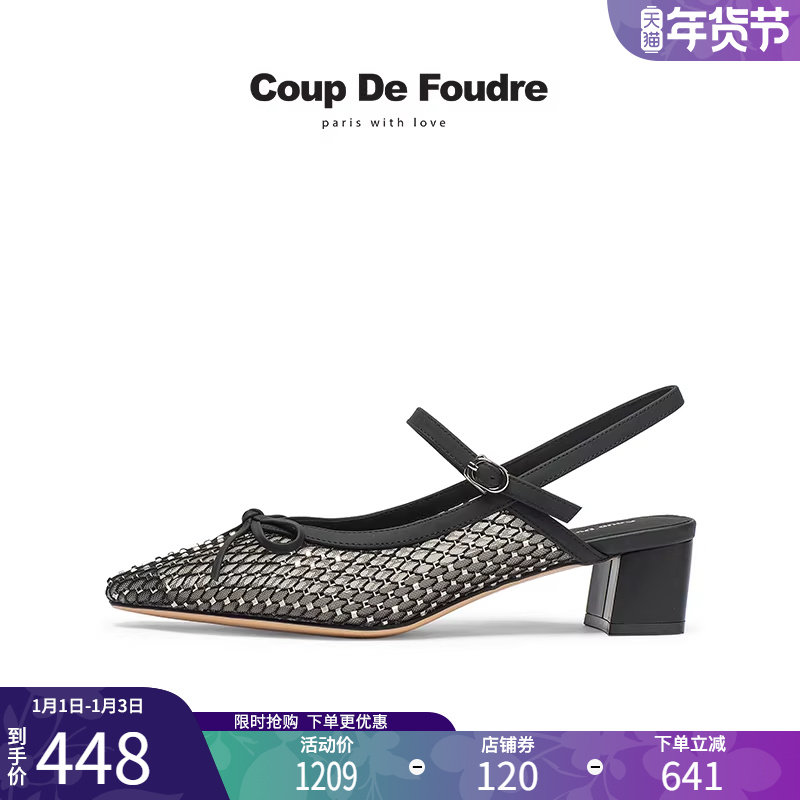 CDF女鞋2025夏季新款法式气质后空凉鞋粗跟水钻蝴蝶结尖头单鞋女