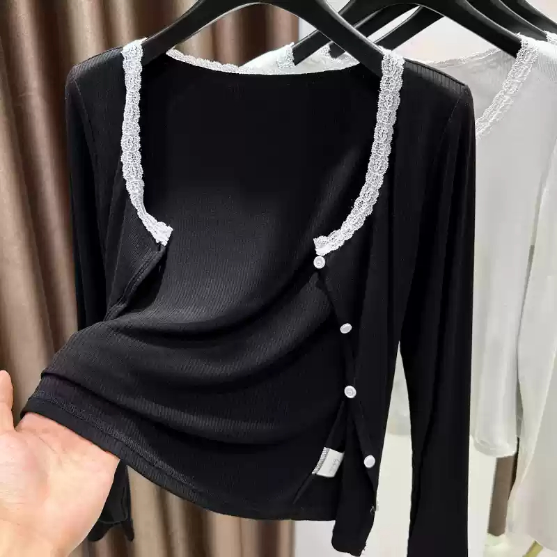 短款披肩外套软糯上衣圆领蕾丝拼接针织衫女春秋2025新款毛衣开衫