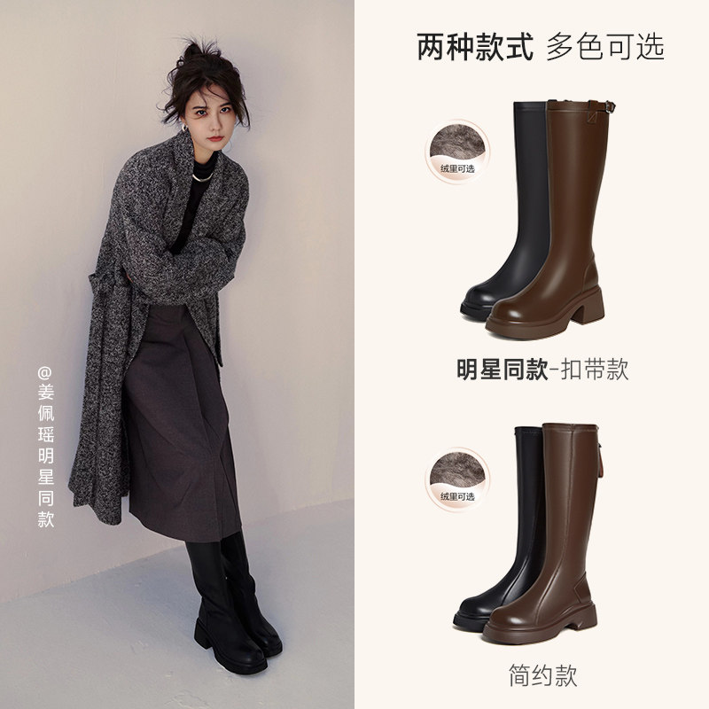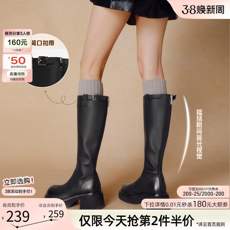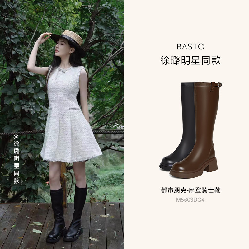 【徐璐明星同款】百思图都市朋克冬商场新款加绒高筒骑士靴女长靴