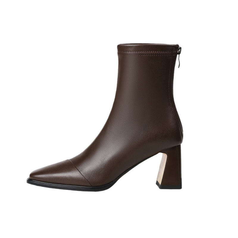 法式复古棕色短靴女粗跟2024秋冬新款方头马丁靴小个子高跟瘦瘦靴