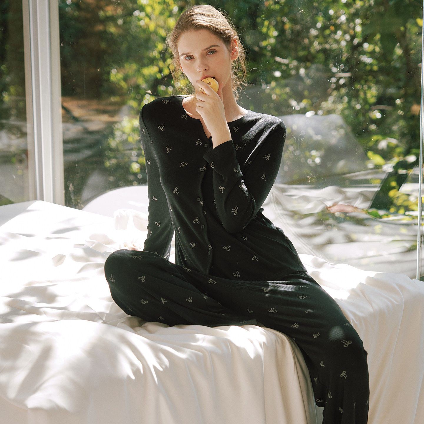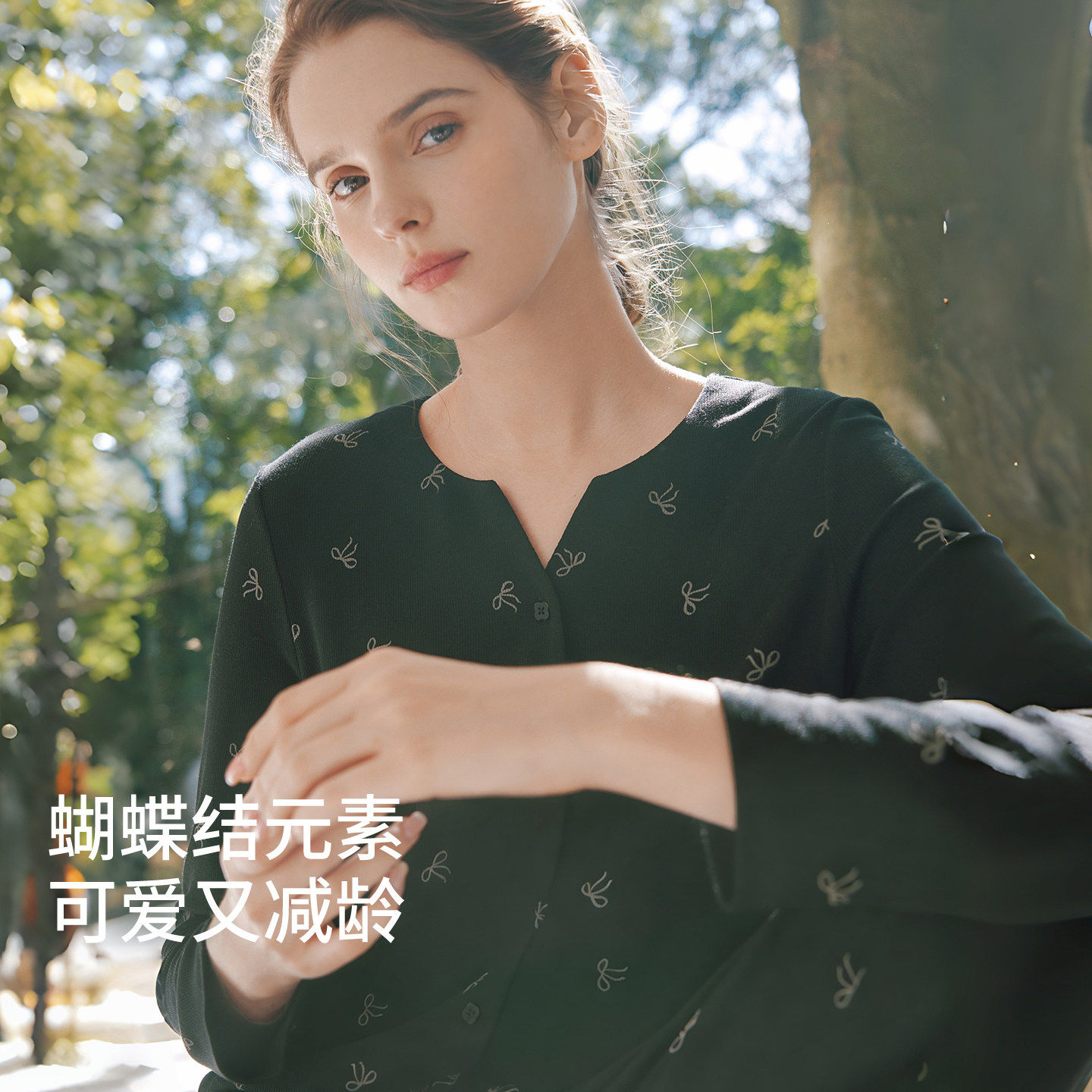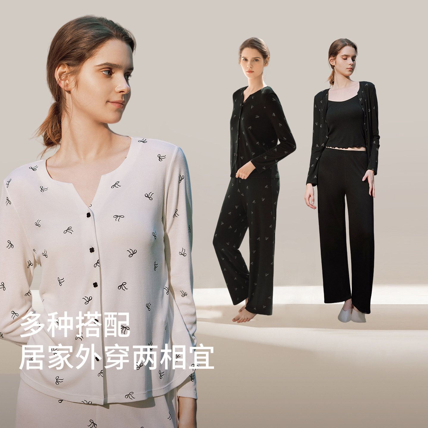 金三塔桑蚕丝睡衣女春夏新款罗纹针织蝴蝶结印花减龄长袖家居服