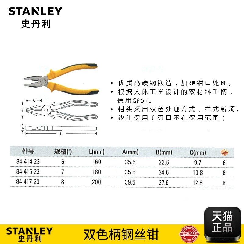 史丹利工具双色柄钢丝钳老虎钳子6寸7寸8寸84-414-23/415/417-23