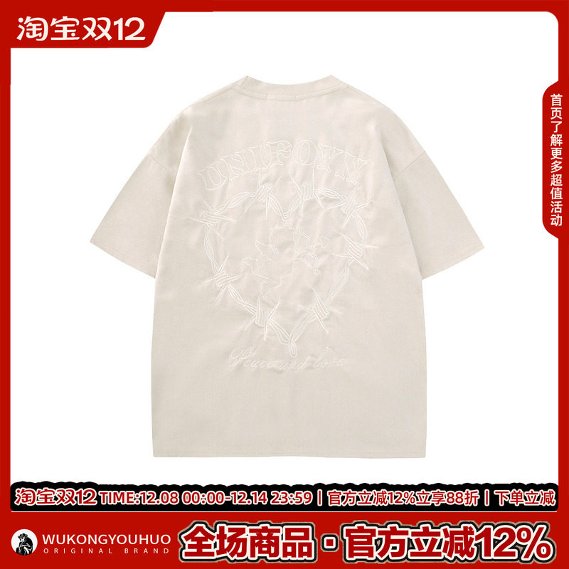 悟空有货美式荆棘爱心刺绣麂皮绒短袖T恤男复古宽松粉色情侣体恤
