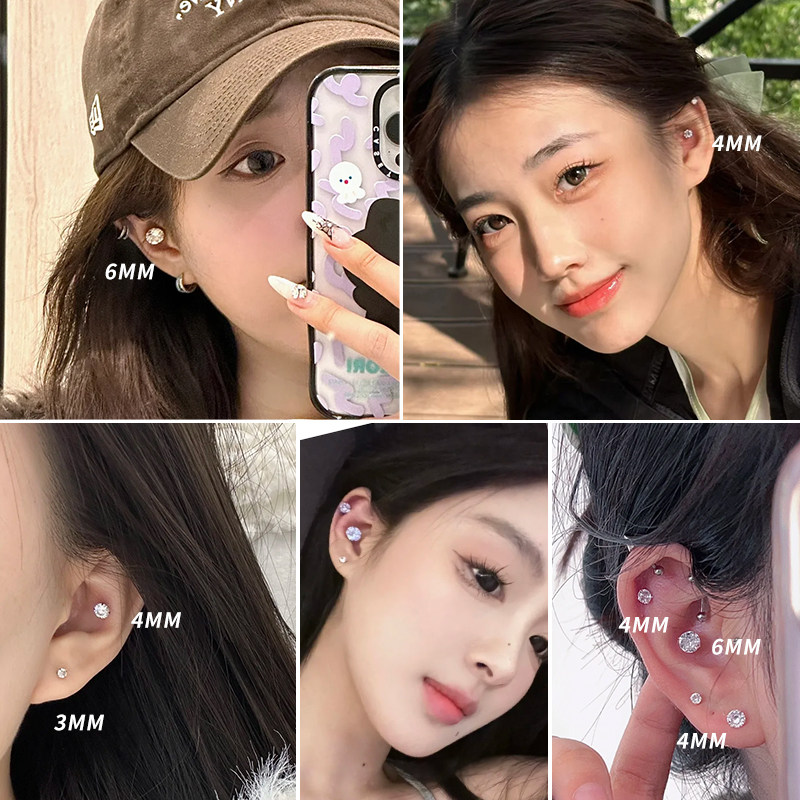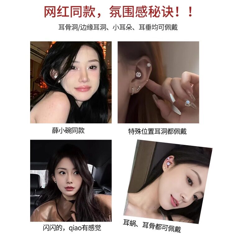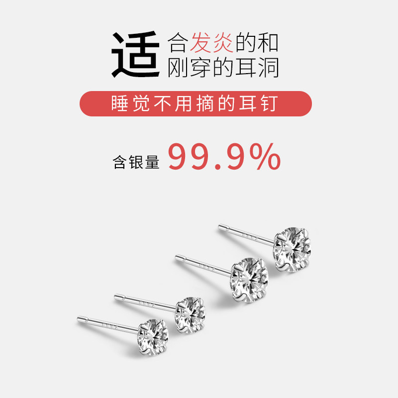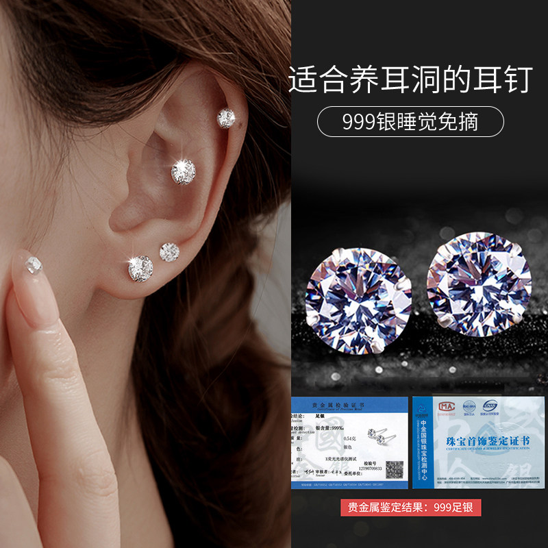 999纯银耳钉女纯银拒绝过敏养耳洞耳棒耳骨钉钻石睡觉不用摘耳饰