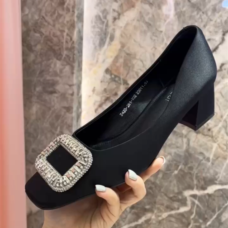 爱诗薇女鞋2026春夏新款真丝单鞋方头水钻扣浅口高跟鞋粗跟瓢鞋