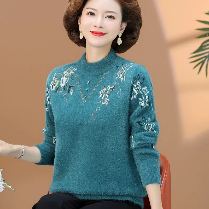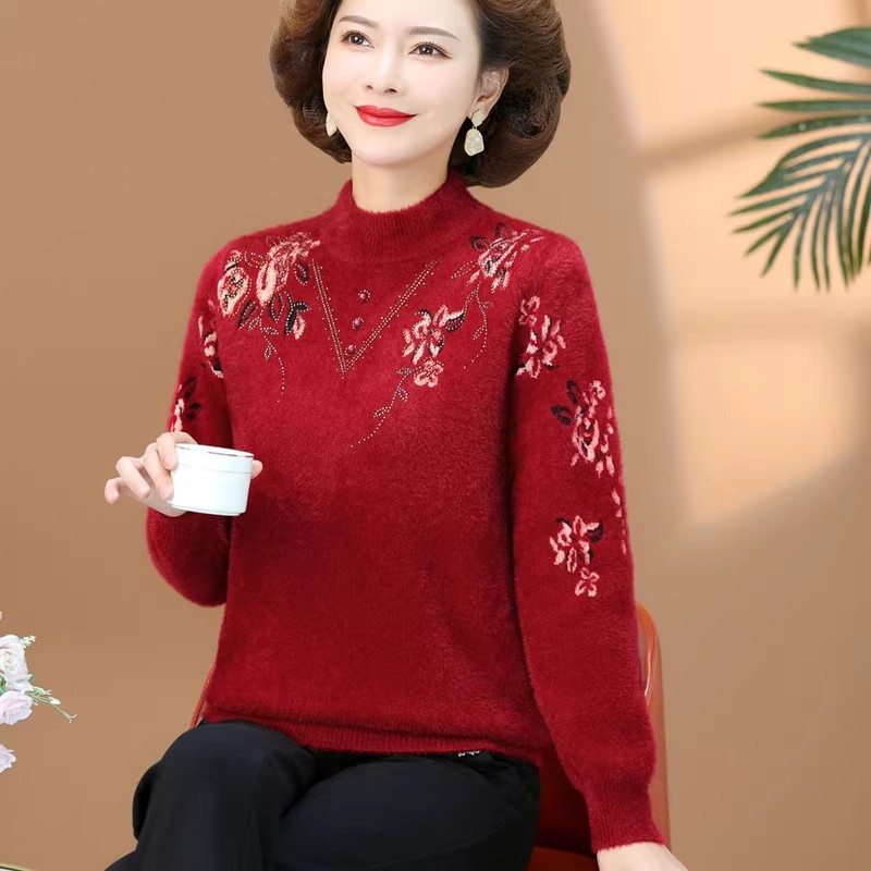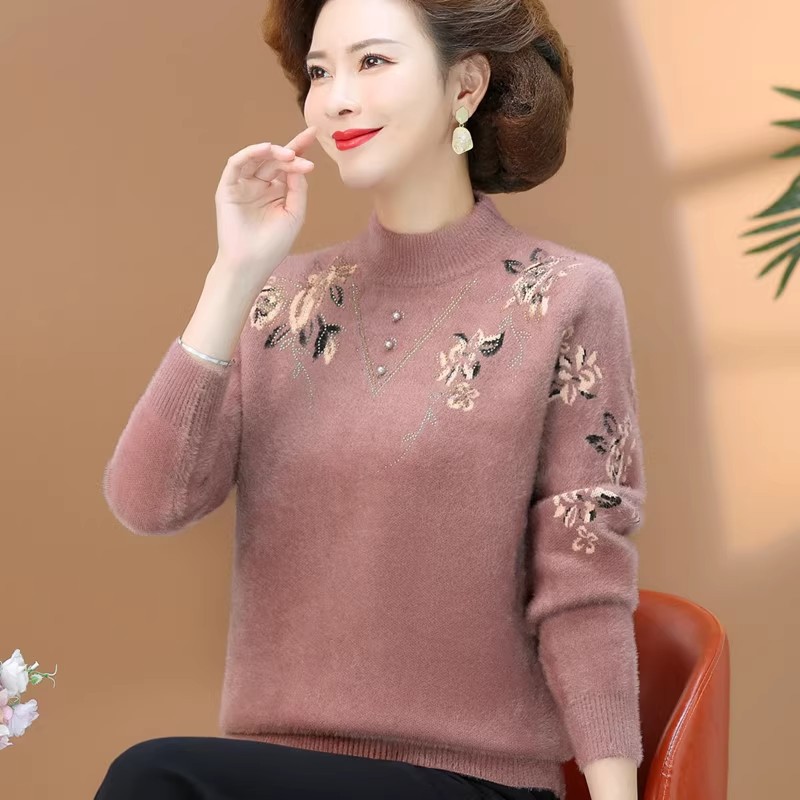妈妈秋冬装加厚水貂绒毛衣女半高领保暖打底衫中老年时尚宽松上衣