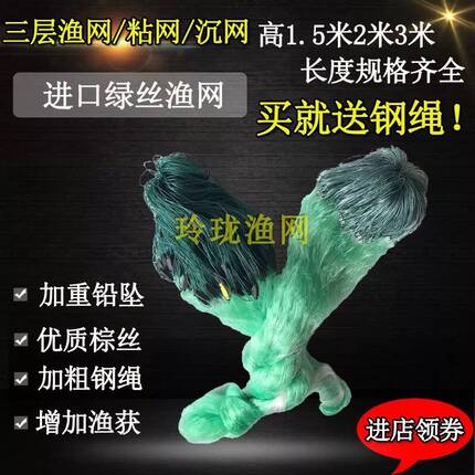 进口绿丝三层渔网2米3粘网捕鱼网