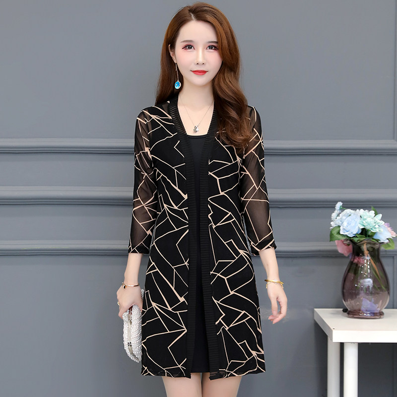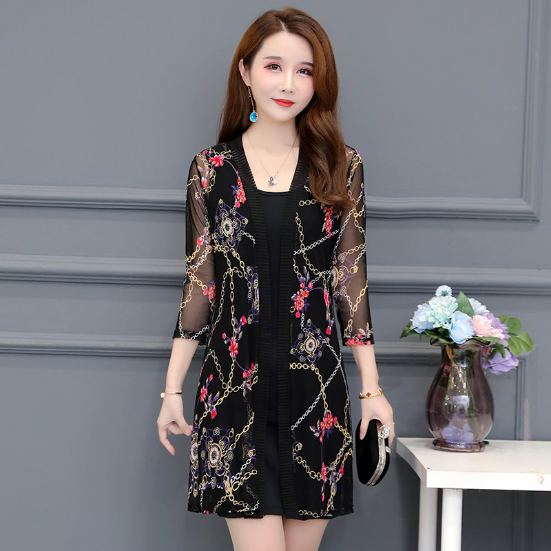 春夏季外搭薄款网纱开衫披肩中长款妈妈七分袖上衣大码防晒衣外套