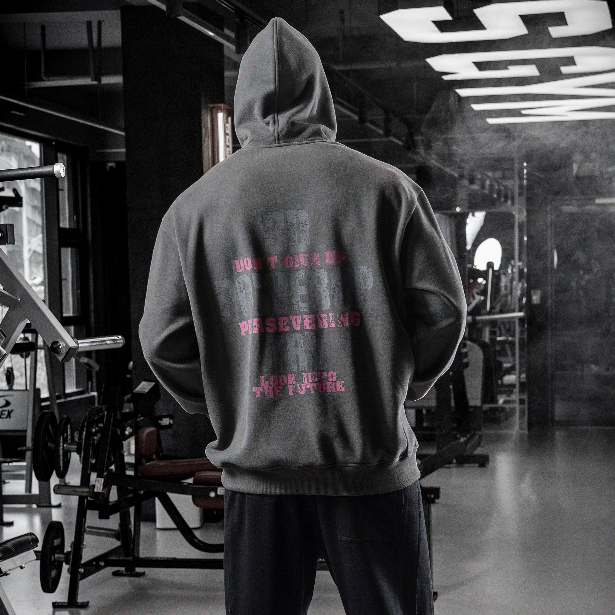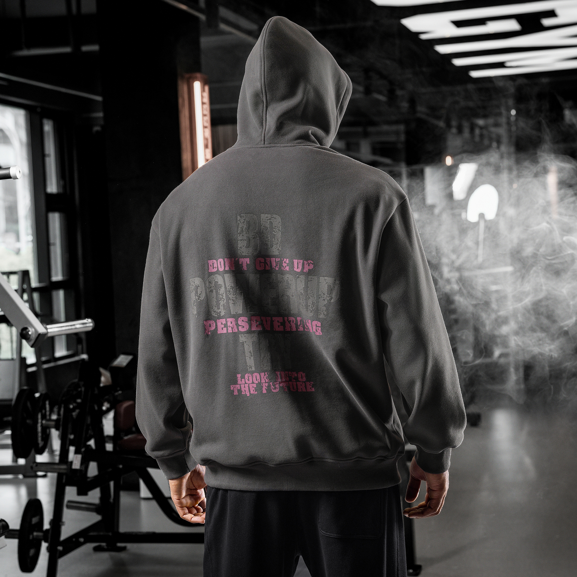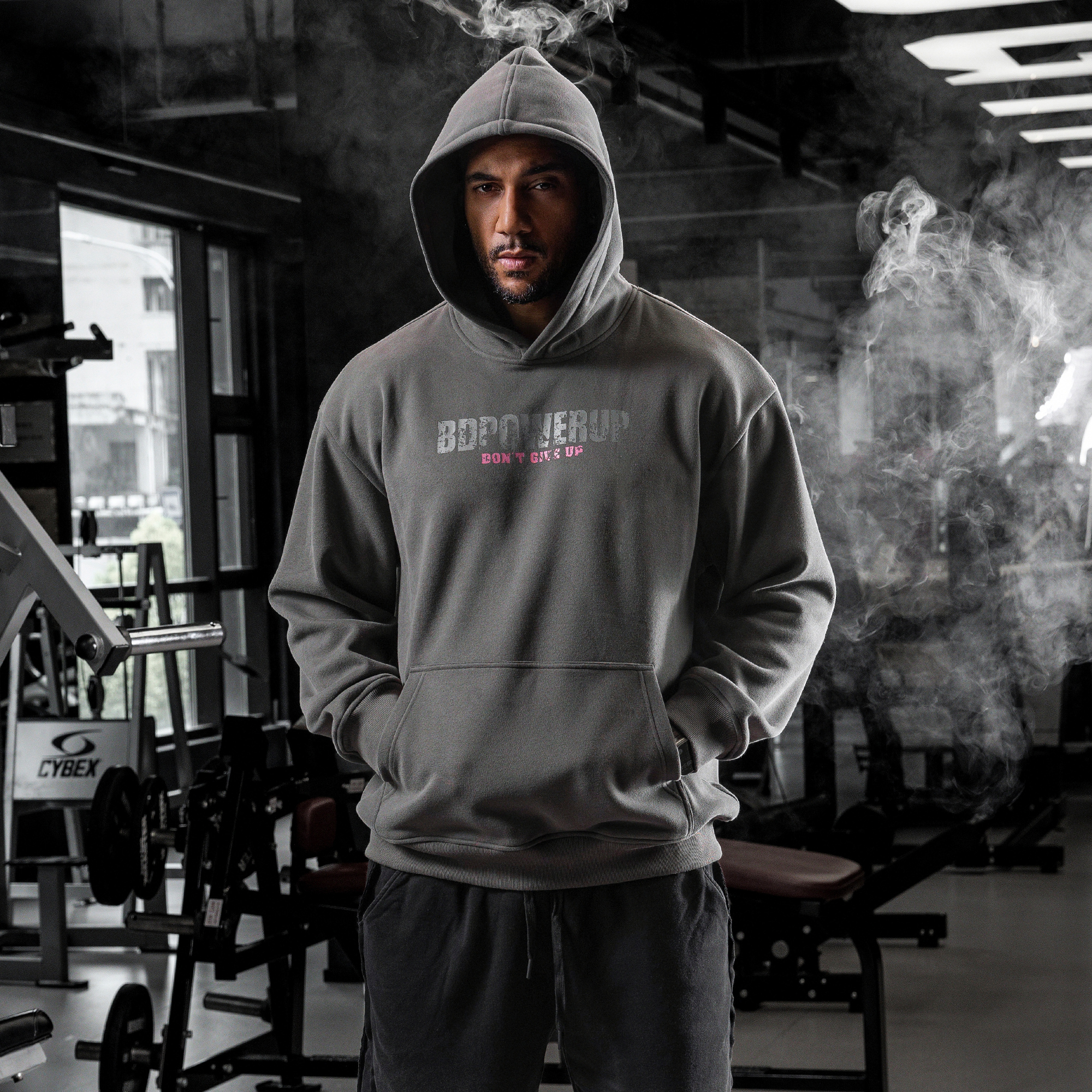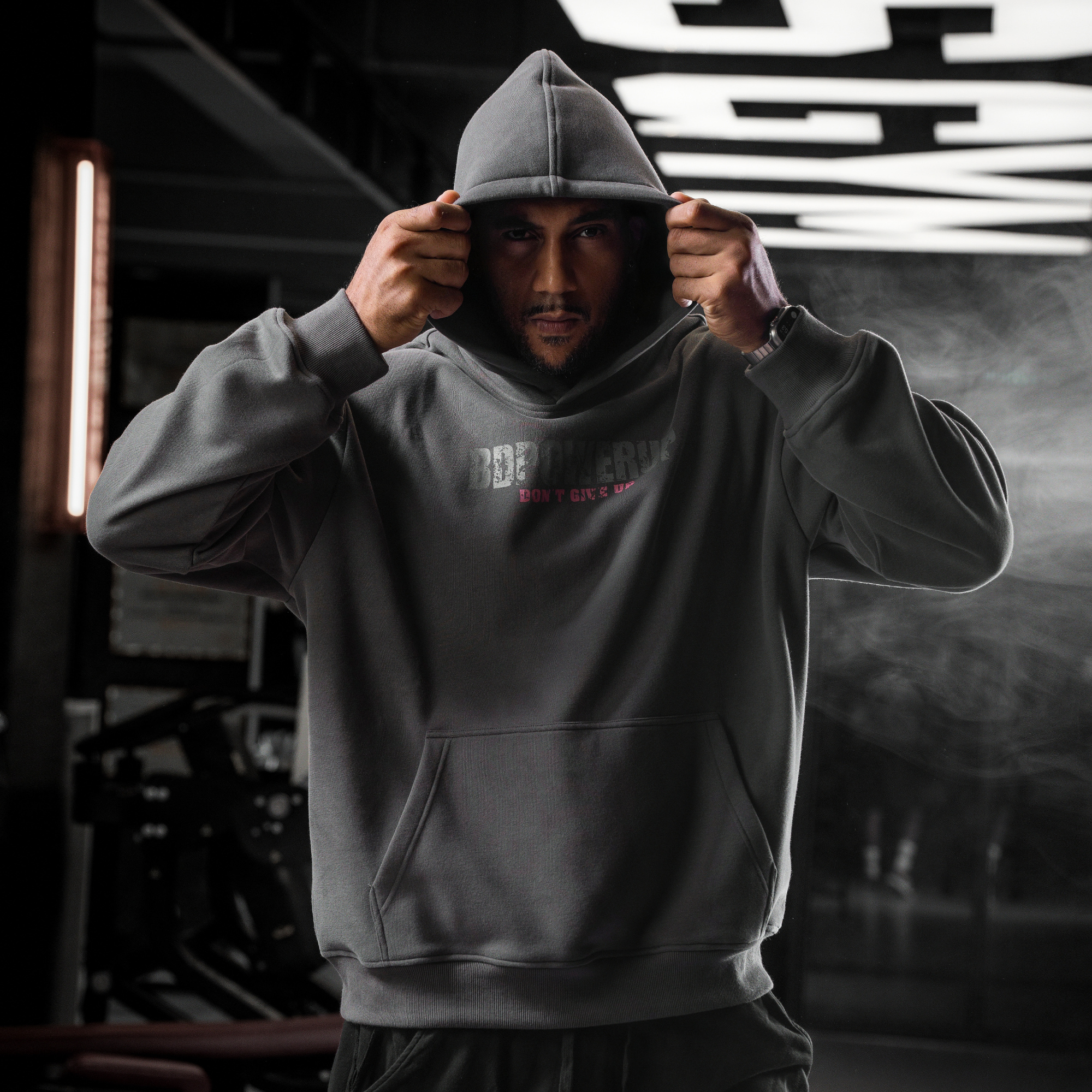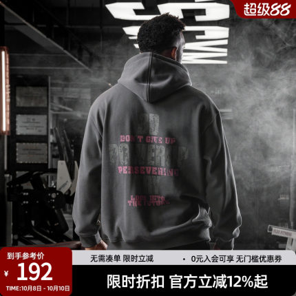 bdpowerup秋冬加绒连帽卫衣男美式复古印花运动套头上衣男宽松