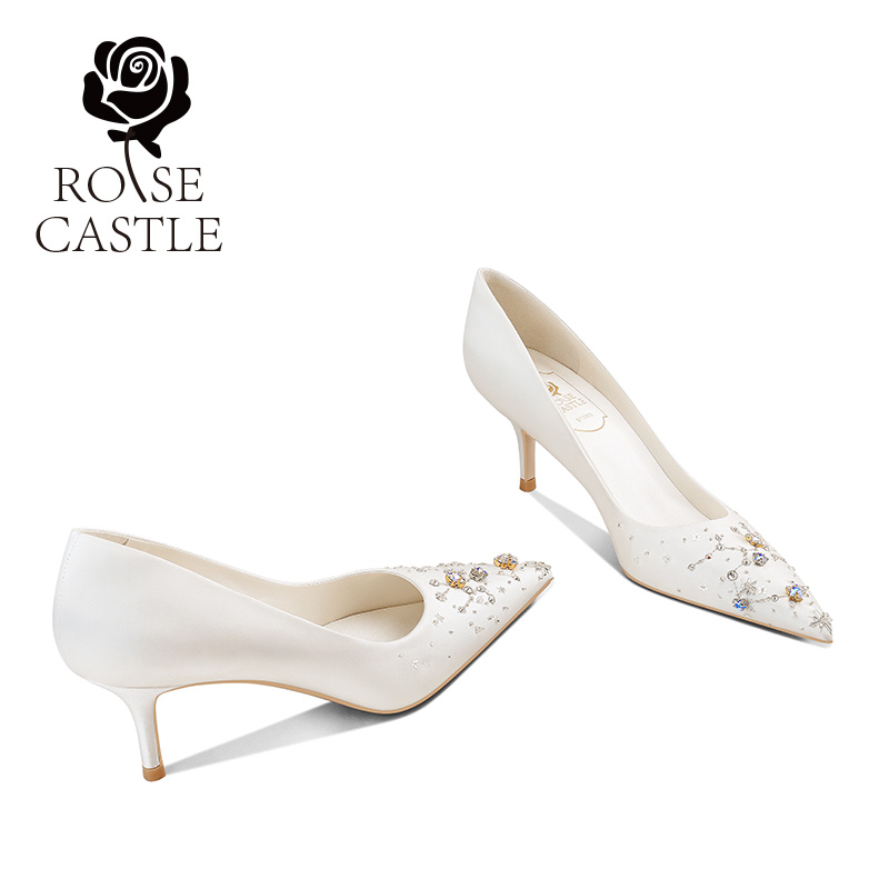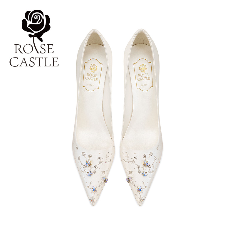 十二星座rose castle 原创手工刺绣婚鞋女新娘鞋白色绸缎高跟单鞋