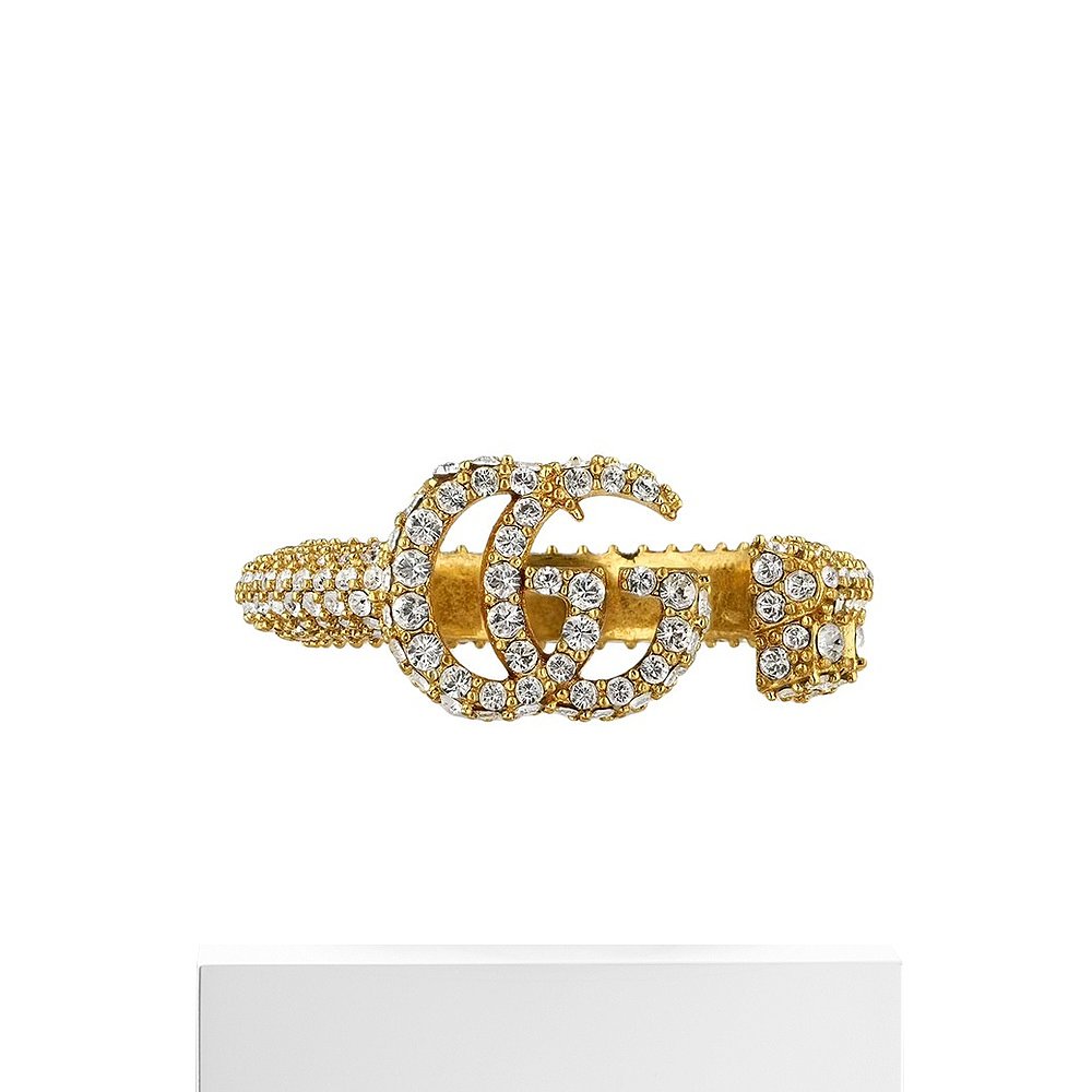 自营GUCCI/古驰 经典款 女士金色黄铜镶透明水晶双G戒指新款