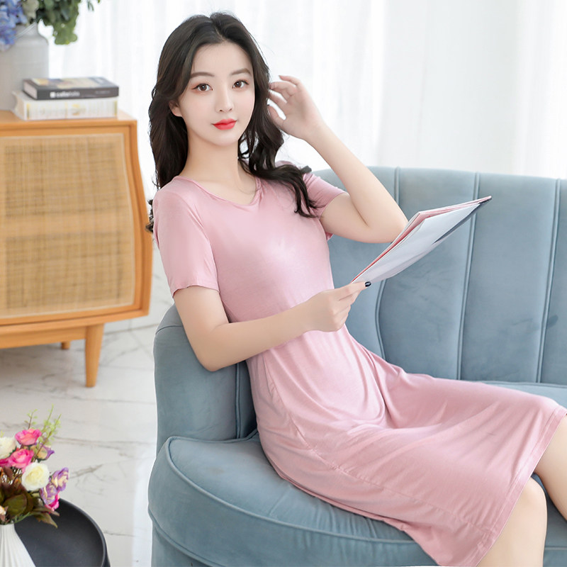 夏季薄款冰丝莫代尔短袖睡裙女大码胖MM宽松纯色中长款圆领连衣裙