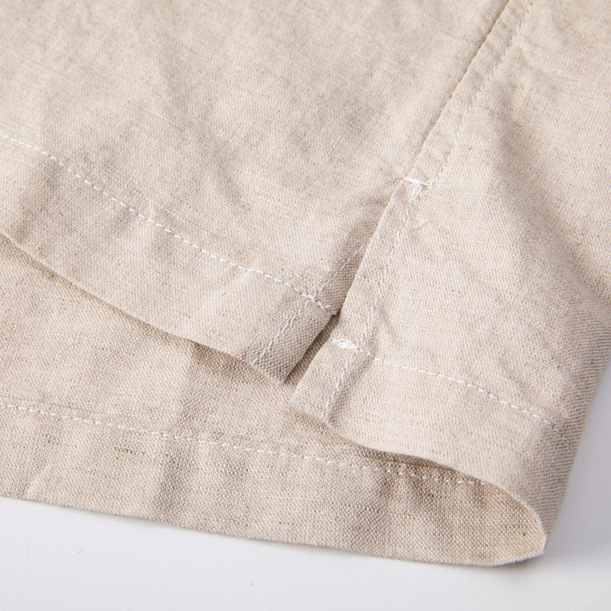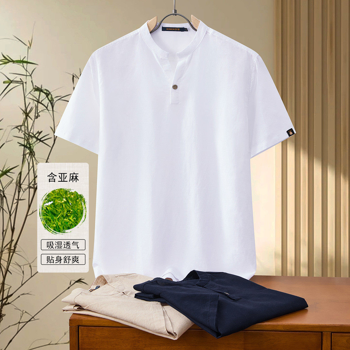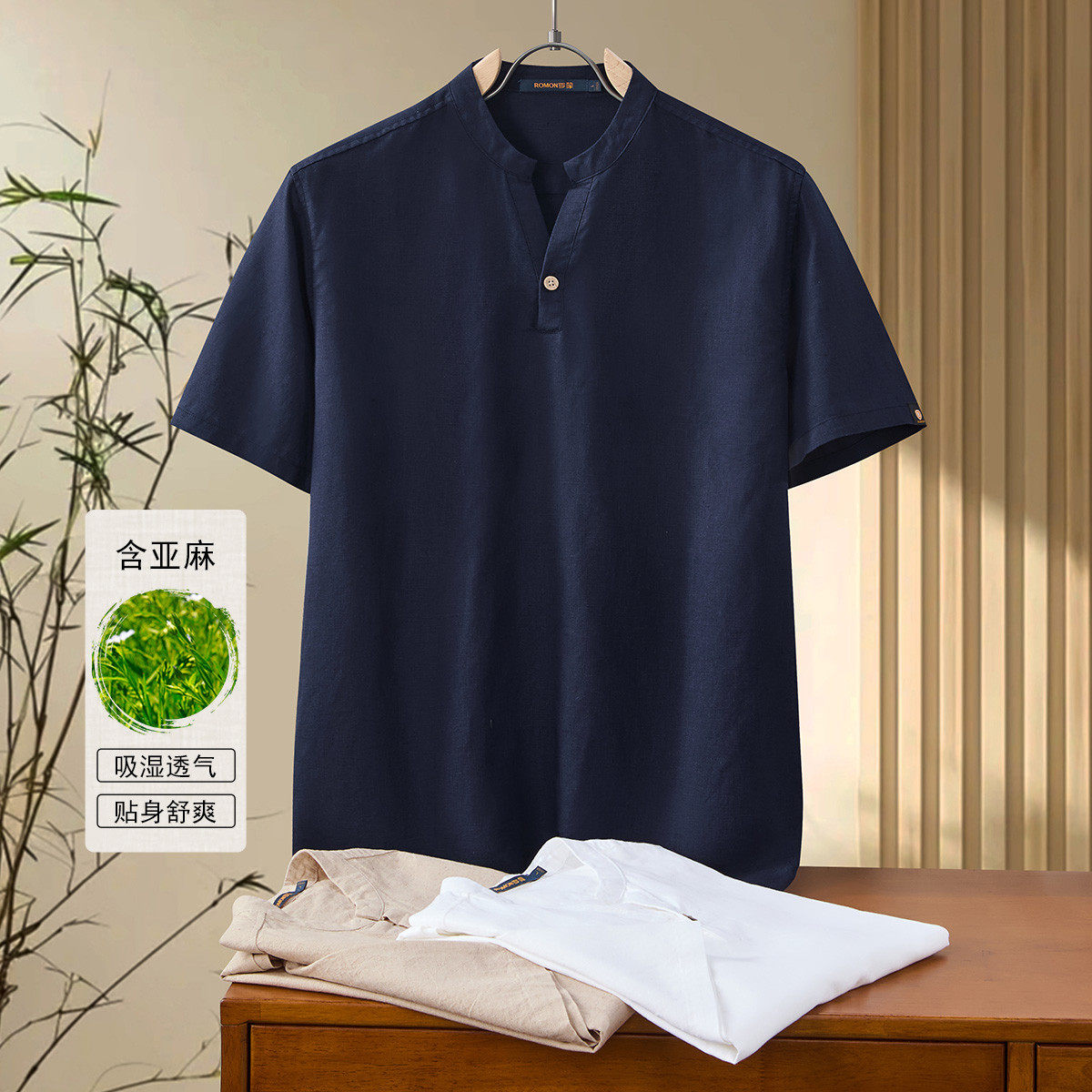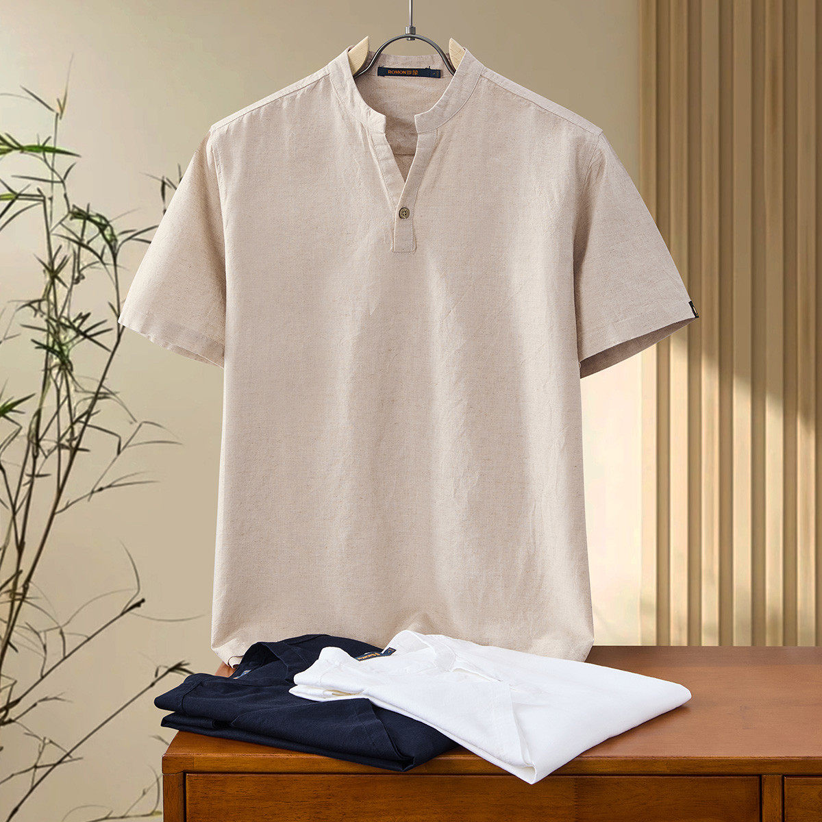 罗蒙亚麻棉小V领短袖T恤男士夏薄款中国风亨利领速干纯色开叉体恤