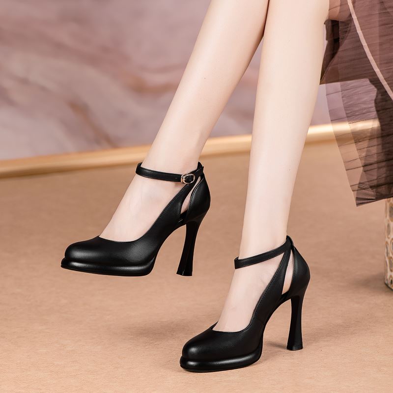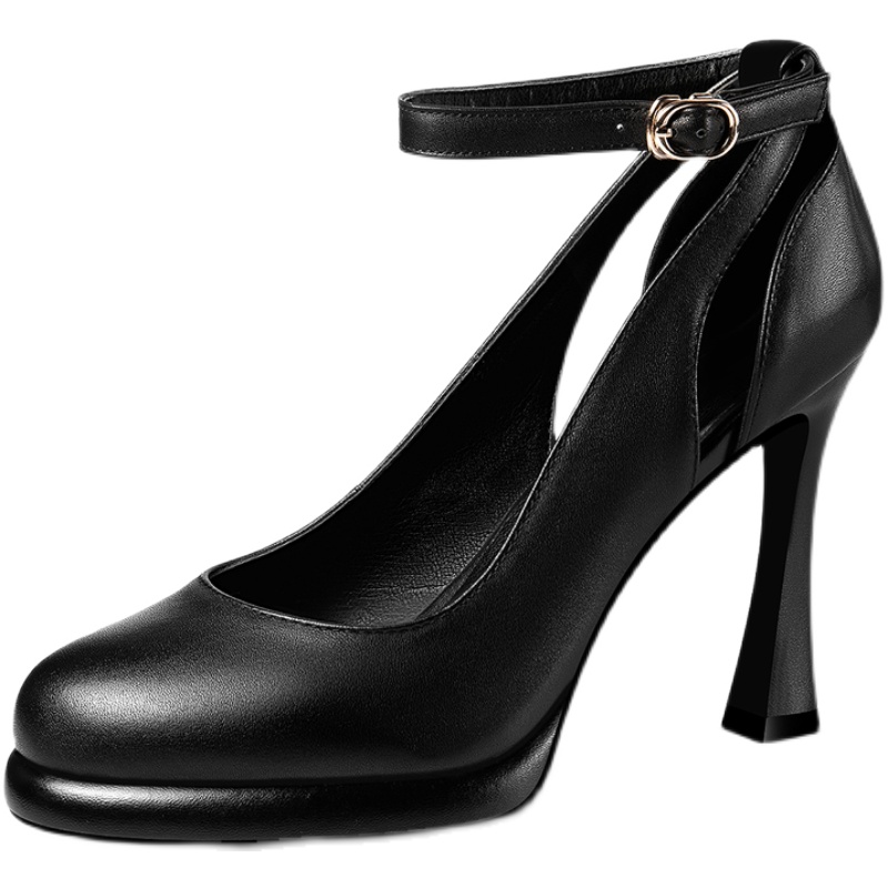 粗跟走秀高跟鞋女春大东真皮工作鞋黑色圆头防水台一字扣带单鞋子
