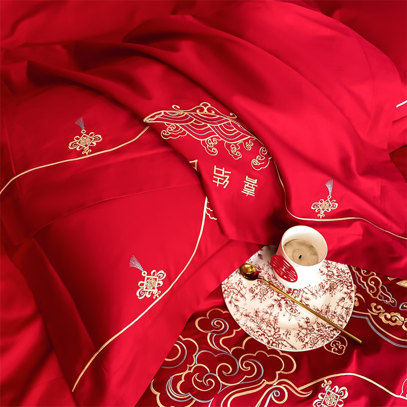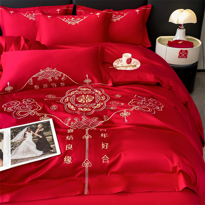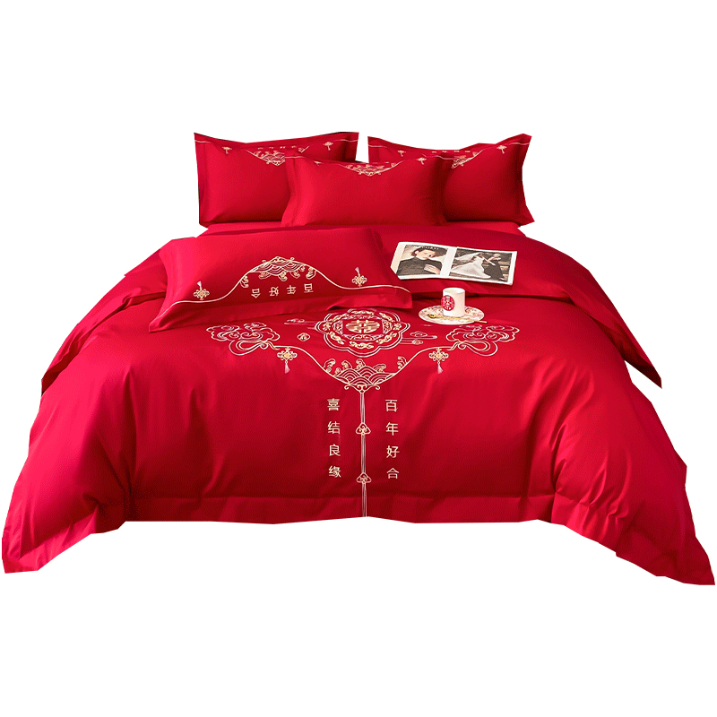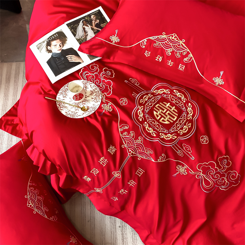嫁娶长绒棉全棉结婚房喜庆四件套红色纯棉刺绣出嫁被套床单床品4