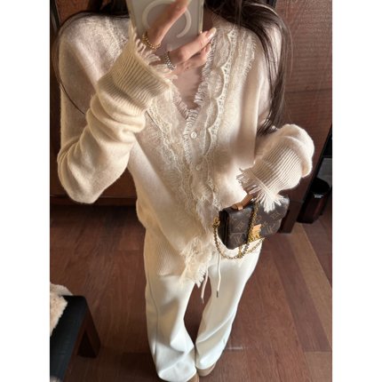 superniniyy 100%羊毛拉毛朦胧感奶油色系针绣蕾丝开衫针织衫毛衣