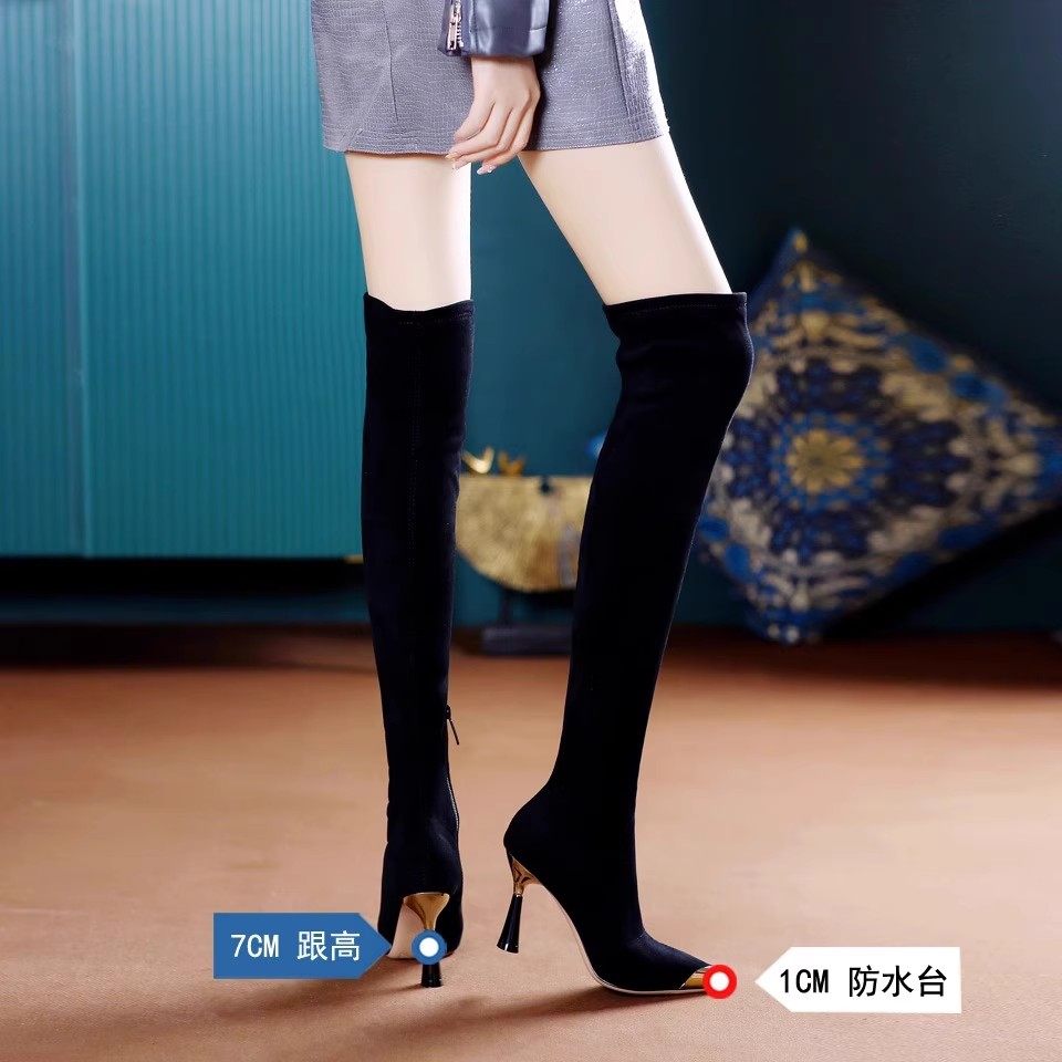 2023年冬季加绒百搭显瘦弹力靴春大东真皮细跟尖头高跟过膝长靴女