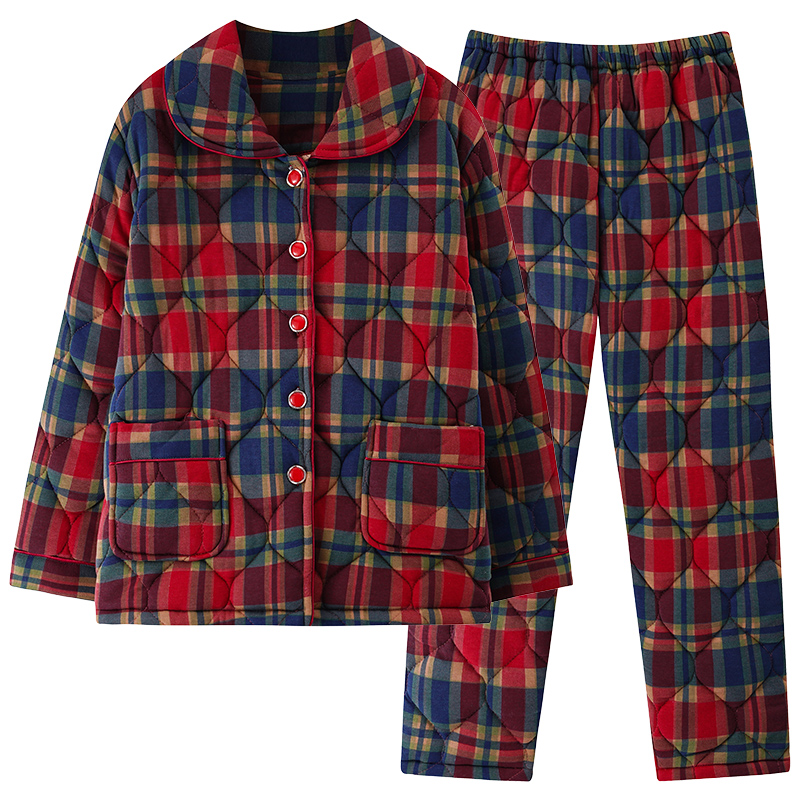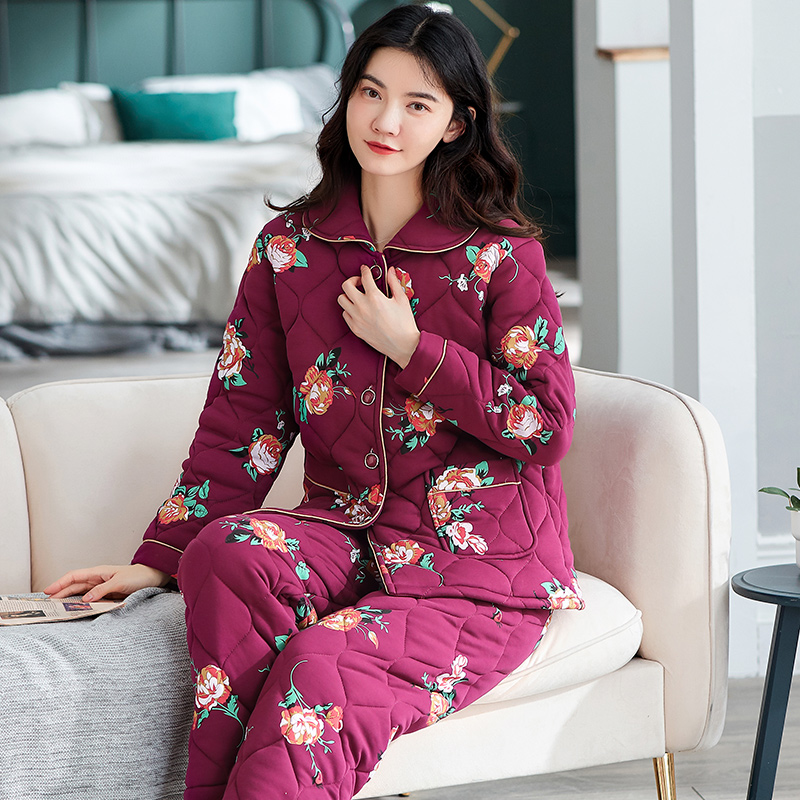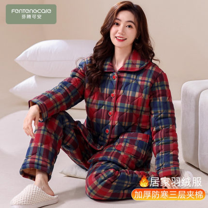 芬腾可安睡衣女士秋冬加厚三层夹棉袄纯棉全棉冬季超保暖大码套装
